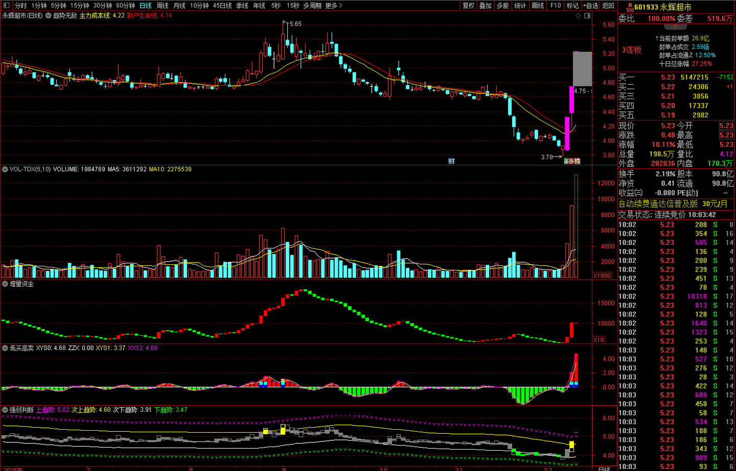技术分析:永辉超市昨日大阳线上涨9.95%,股价处于下行趋势,但向下动能有所减弱,成交金额较昨日增加131.08%。日线走出三个白武士形态,短期均线组合金叉后上行,近期MACD走出水下金叉,RSI指标呈多头排列且连续多日处于上行趋势。