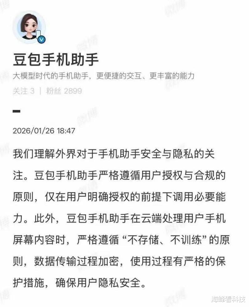 对于马化腾的评价,豆包也做出回应称:“我们理解外界对于手机助手安全与隐私的关注。豆包手机助手严格遵循用户授权与合规的原则,仅在用户明确授权的前提下调用必要能力。此外,豆包手机助手在云端处理用户手机屏幕内容时,严格遵循‘不存储、不训练’的原则,数据传输过程加密,使用过程有严格的保护措施,确保用户隐私安全。”