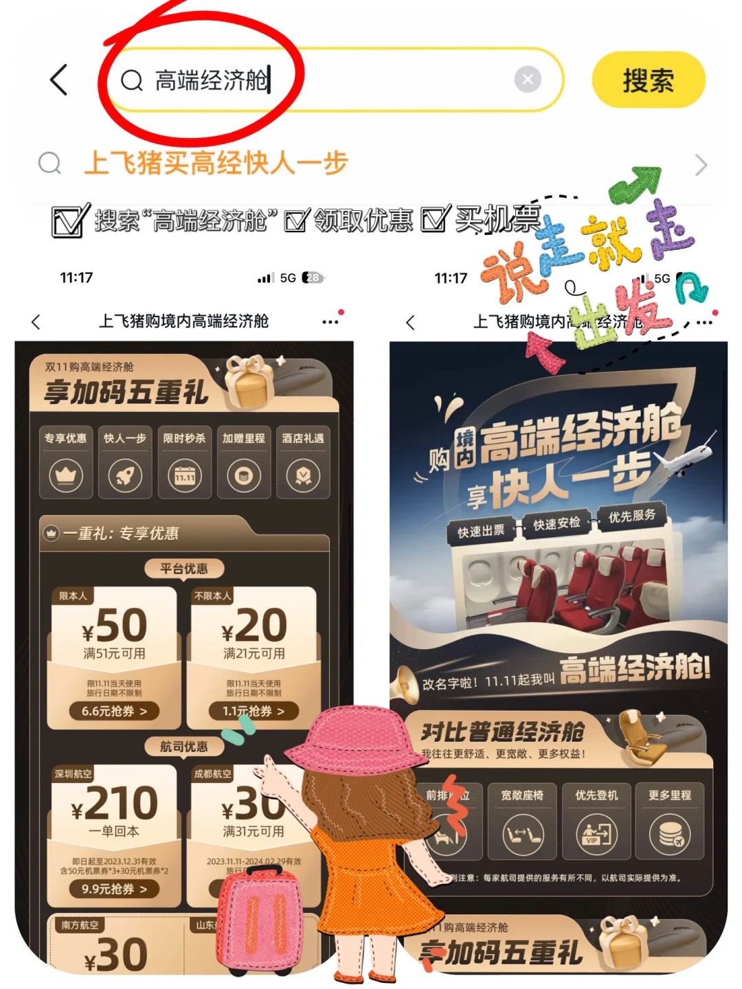 现在在飞✈️🐷搜🔎“高端经济舱”还能抢平台、航司优惠🎫券,双十一当天使用。
