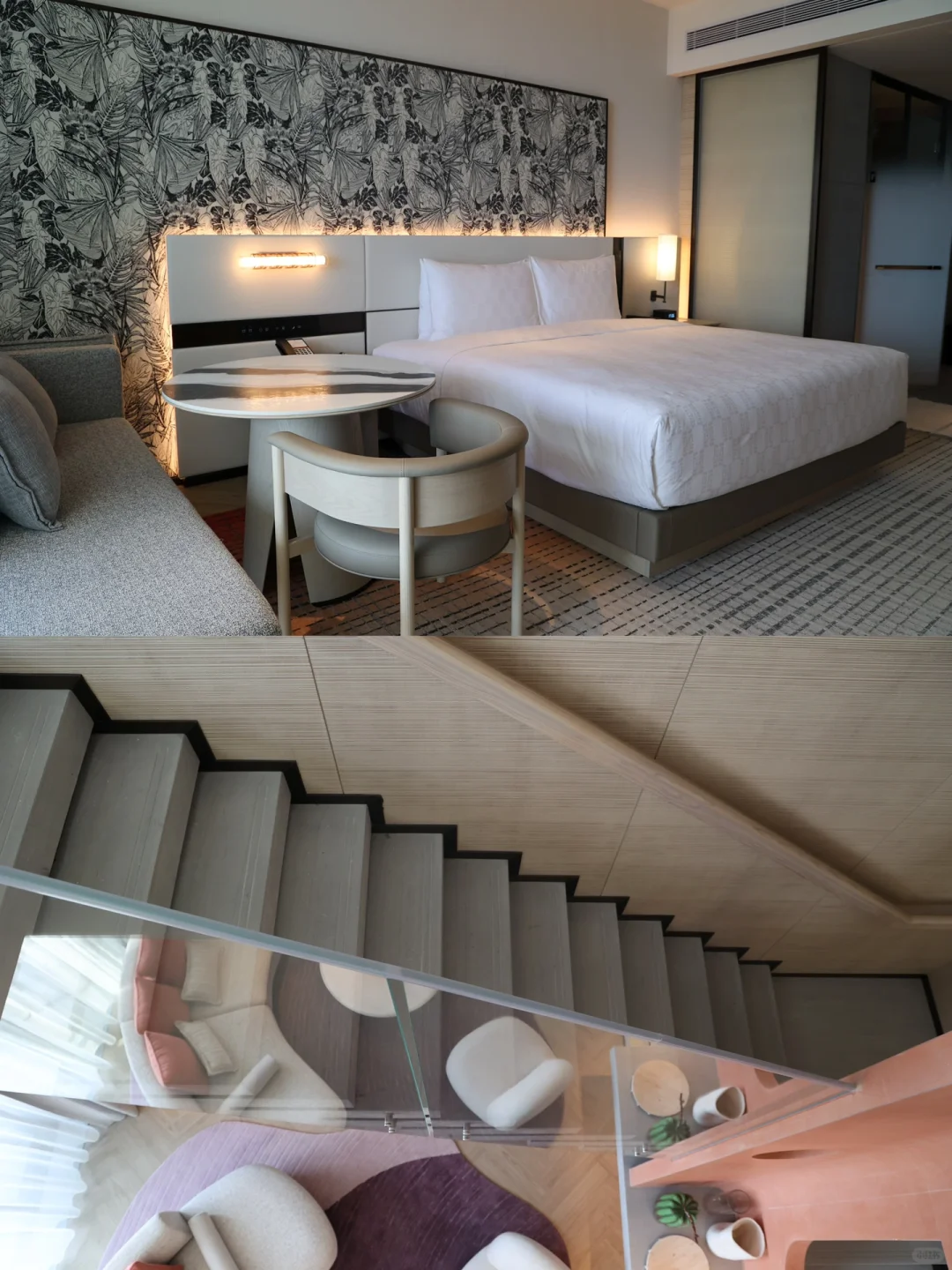 充满童趣的旋转滑梯让大人也能再次释放内心的童心!套房内设有一间专属于孩子的儿童房,装饰着超酷的太空舱儿童床和卡通洗护用品,提供贴心的儿童桌椅。多巴胺配色的墙壁为房间营造了快乐温馨的氛围。