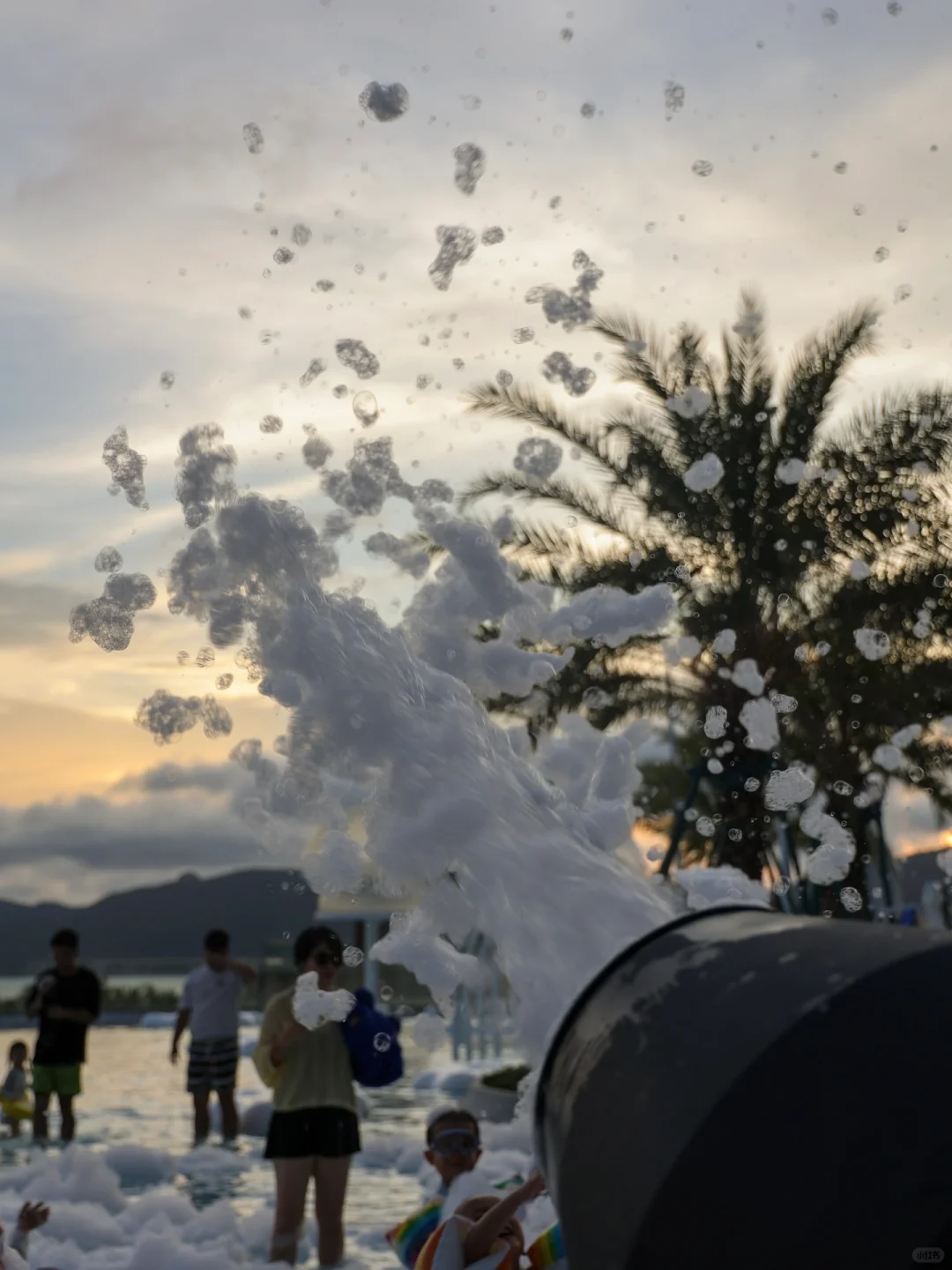 设有儿童专属泳池区域,特别推荐每天傍晚17:45-18:45的泡泡趴,夕阳下泳池中漫天飘洒的白色泡泡🫧,犹如梦幻。