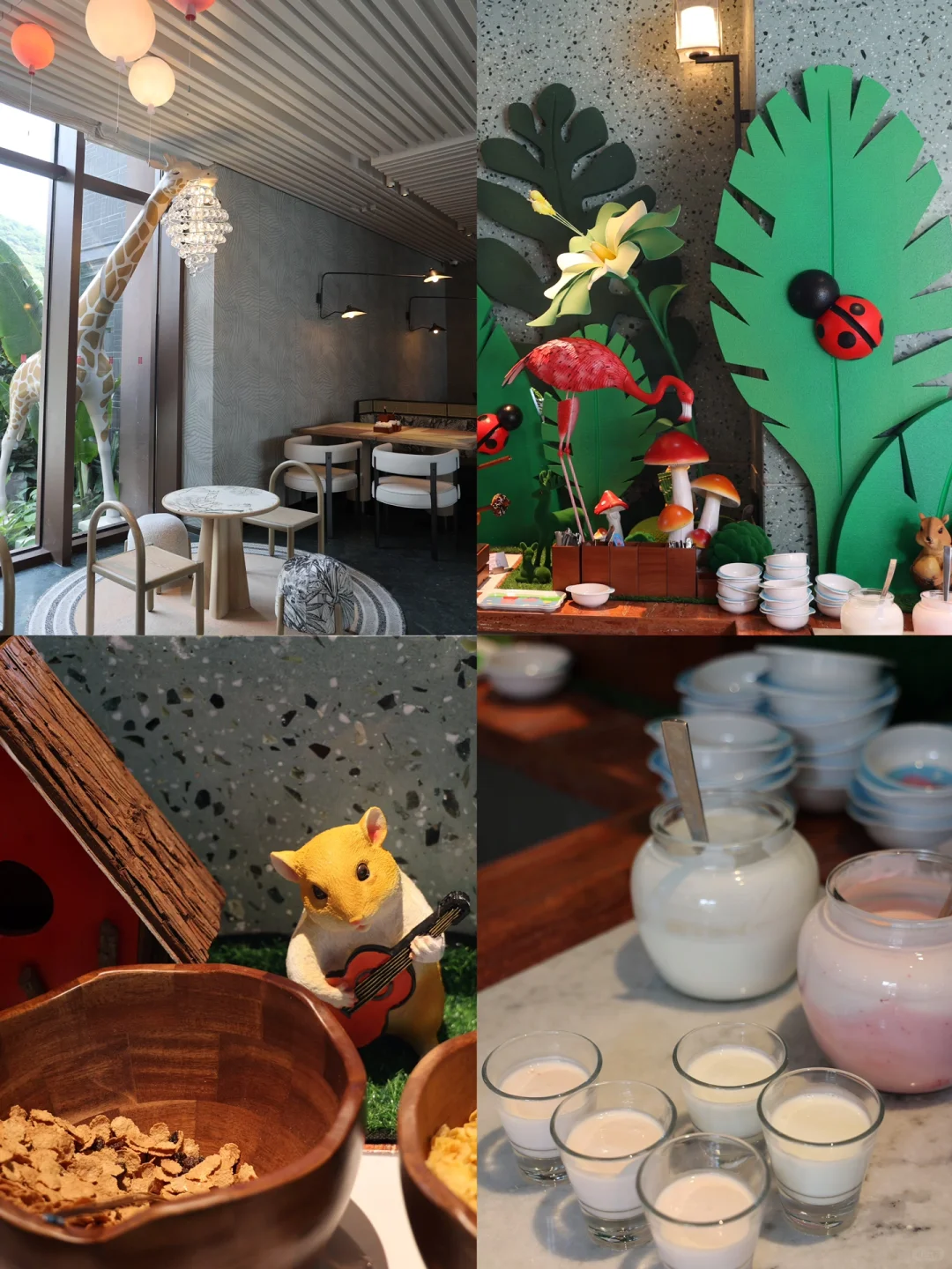 酒店的早餐还特设了儿童就餐区,在一只长颈鹿的陪伴下,配合适合儿童的餐具,独立的取餐区,儿童喜欢的面包,麦片,酸奶等餐食,让早餐时间也变得丰富有趣。