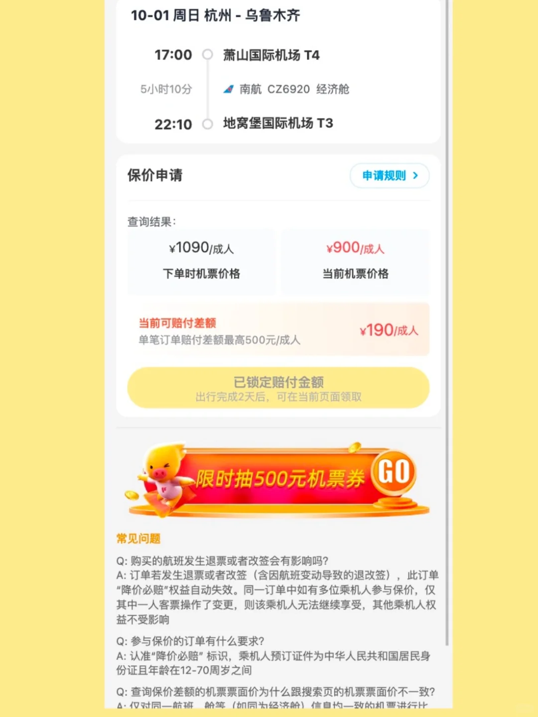 选择飞往乌鲁木齐的航班较多,建议提前预订机票。今年新疆旅游非常火热,我推荐你提前预定以避免错过机票。飞猪现在推出了降价必赔的活动,只要在起飞前两小时出现降价,你可以锁定差价并获得赔付,最高可达500元。所以不用担心提前订票后会遇到降价,你可以放心预订。