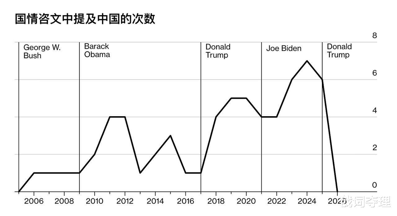 这张图表清晰地勾勒出2005年以来美国总统国情咨文中提及中国次数的剧烈波动:从布什时期的零星提及,到奥巴马任内的起伏,再到特朗普第一任期和拜登时期的显著上升,直至2026年特朗普第二任期的国情咨文,曲线直接归零,创下自2005年以来首次未直接提及中国的纪录。