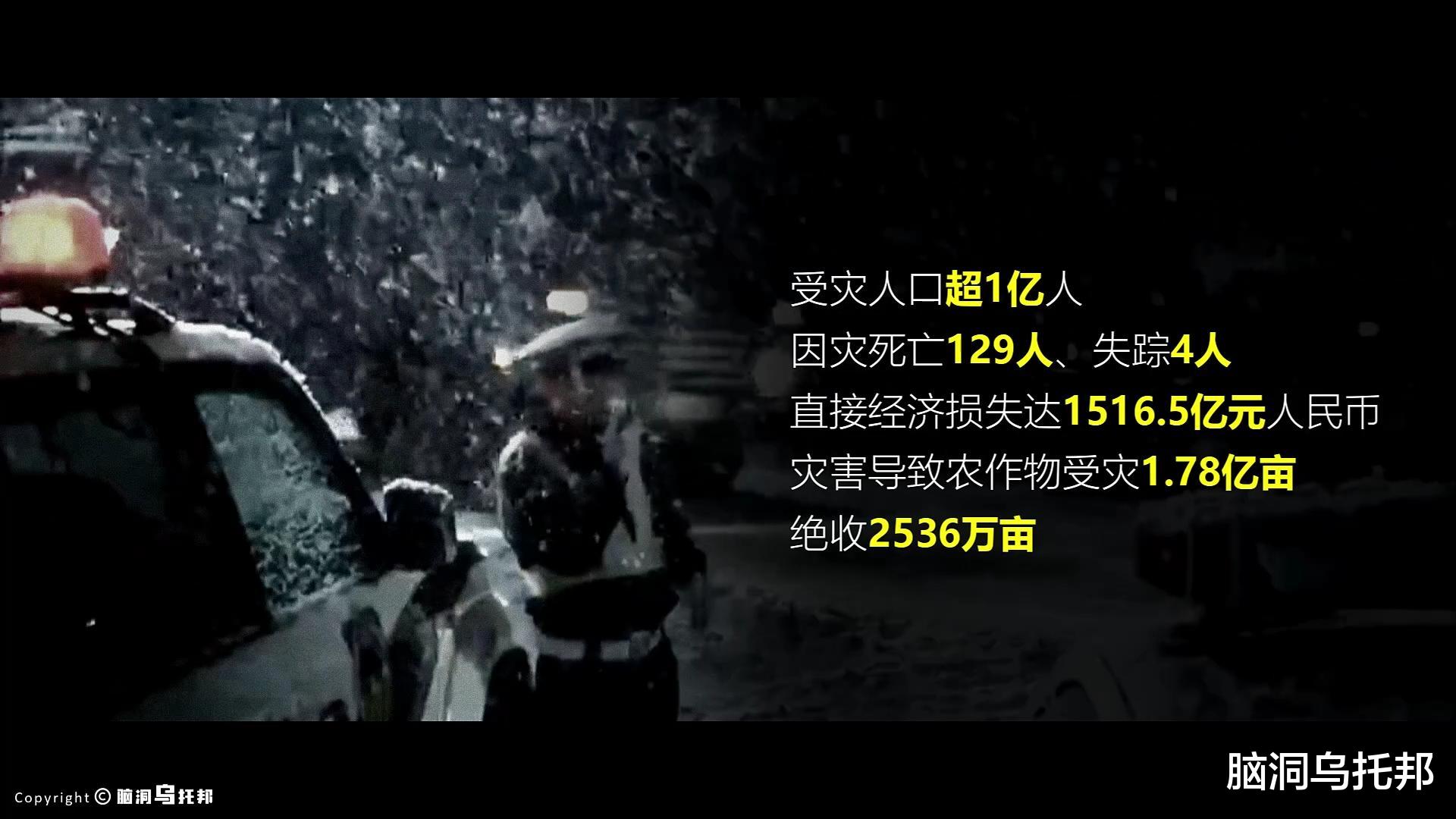 冰雪消融之后,官方最终统计,这场雪灾造成了超过1亿人受灾,129人不幸遇难,4人失踪,直接经济损失高达1516.5亿元人民币,农业受灾面积达到了1.78亿亩,绝收2536万亩。