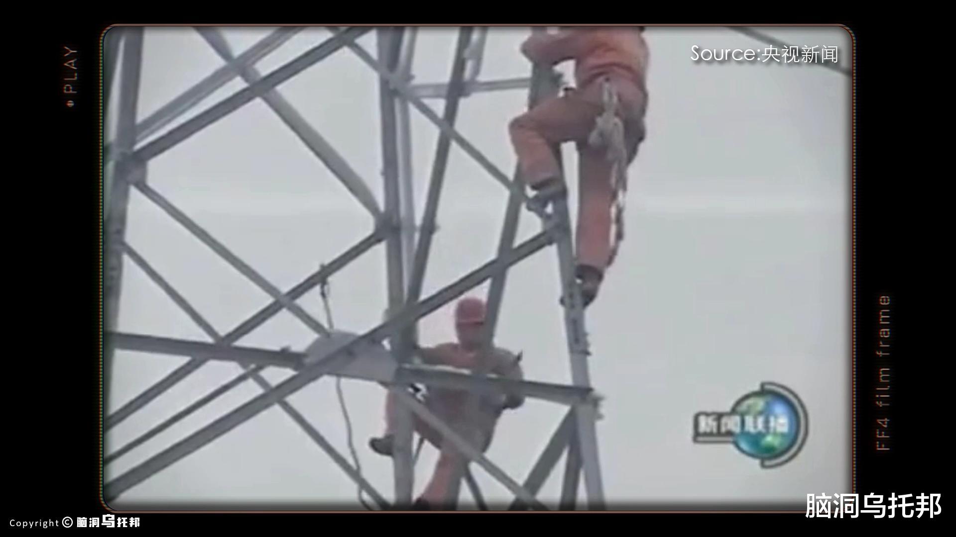 为了恢复供电,无数电力工人只能冒险。他们需要徒手爬上40多米高的冰冻铁塔,在零下几摄氏度的狂风中,花将近三个小时,用木棒一一敲掉固定高压线的绝缘瓷瓶上结的厚厚的冰层。