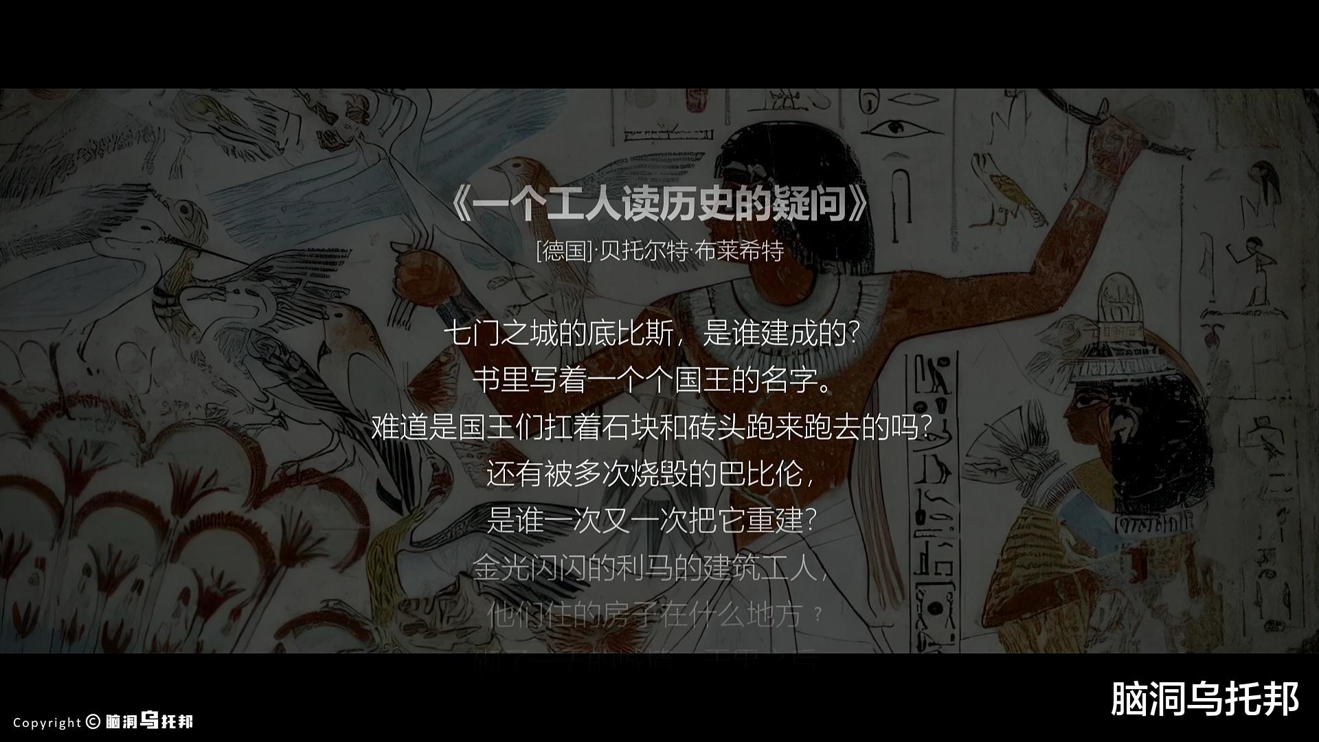 他问「七门之城的底比斯,是谁建成的?书里写着一个个国王的名字。难道是国王们扛着石块和砖头跑来跑去的吗?还有被多次烧毁的巴比伦,是谁一次又一次把它重建?