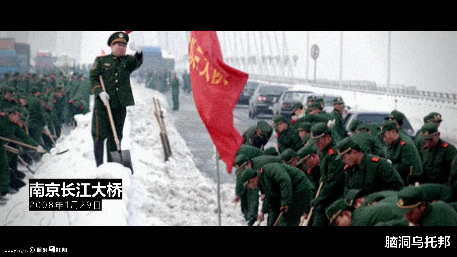 在南京长江大桥,3000名军民昼夜守候,雪随下随清,就是为了保证这座跨江咽喉的畅通。