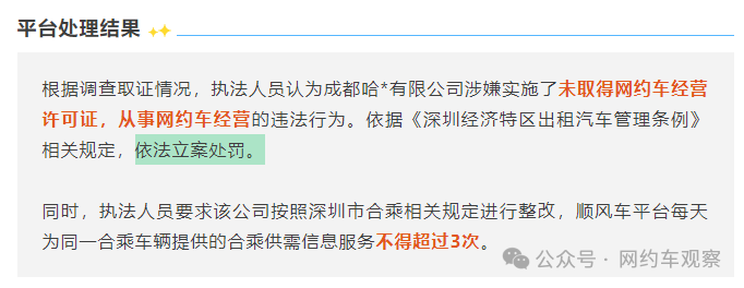 平台也因为没有取得深圳的网约车经营许可证,却给周某派了9单,还每单抽成10%的信息服务费,也被依法立案调查。