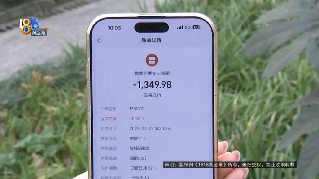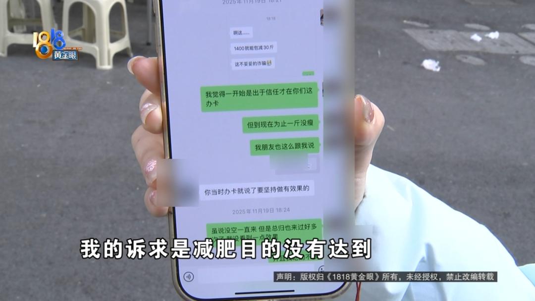 记者:你原来是?朱女士:原来到他们店是117.5斤,现在也差不多。我的诉求是减肥目的没有达到,并且我感受到你们毫不专业,你们只要把那1000多块钱退给我就可以了。