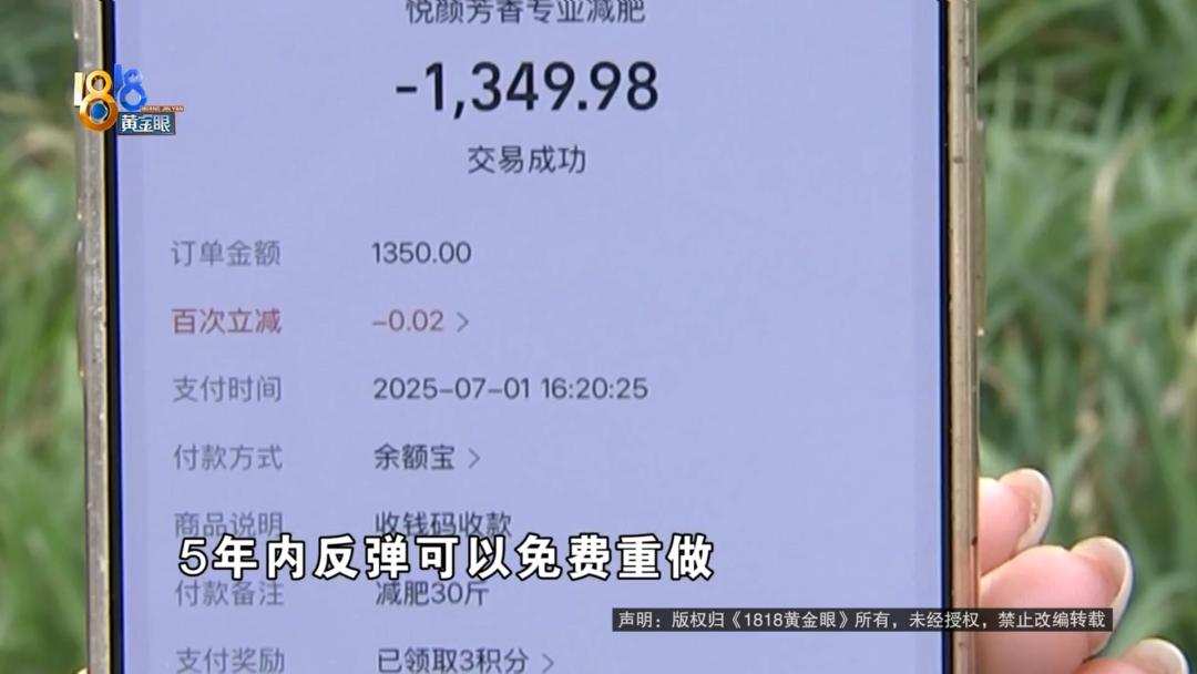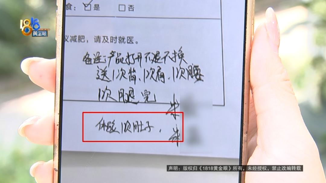 朱女士:她当时承诺的是3个月内就能瘦30斤,30斤是帮我减完为止的。5年内反弹可以免费重做,不限次数。