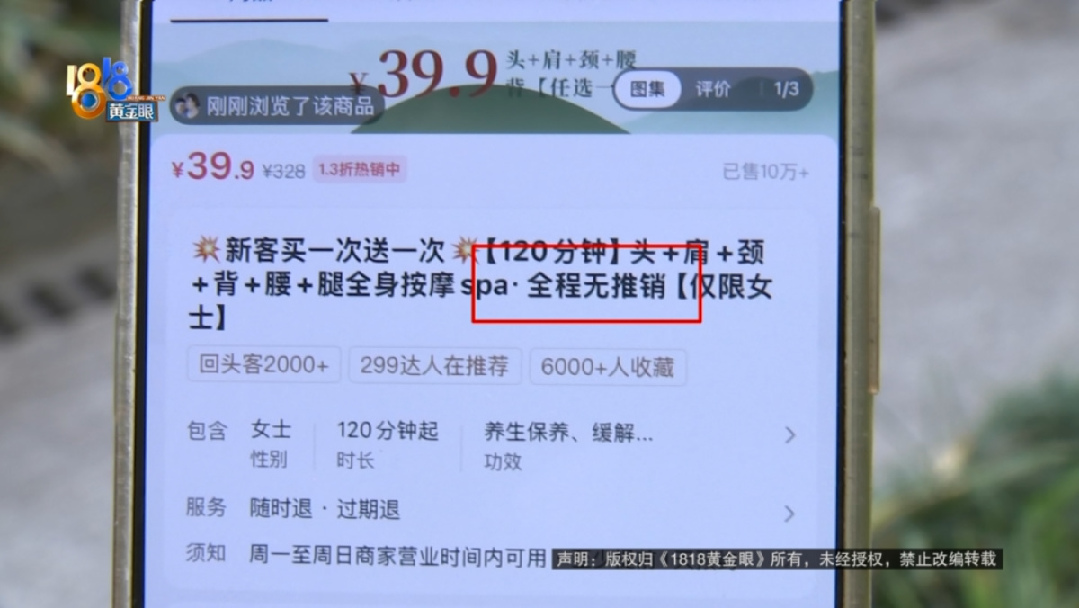 朱女士:店名都是假的,是不一样的店名,实际上是做减肥的。给我按摩按着按着,按了大概十几二十分钟,就开始营销她的减肥。他们店是只接待女客的,利用女孩子耳根子软、心软,店长跟店员两个人一唱一和。问她我需要减肥,我需要节食吗?需要运动吗?她说都不需要,只要靠她们店给我点点穴、按按摩就能减肥。