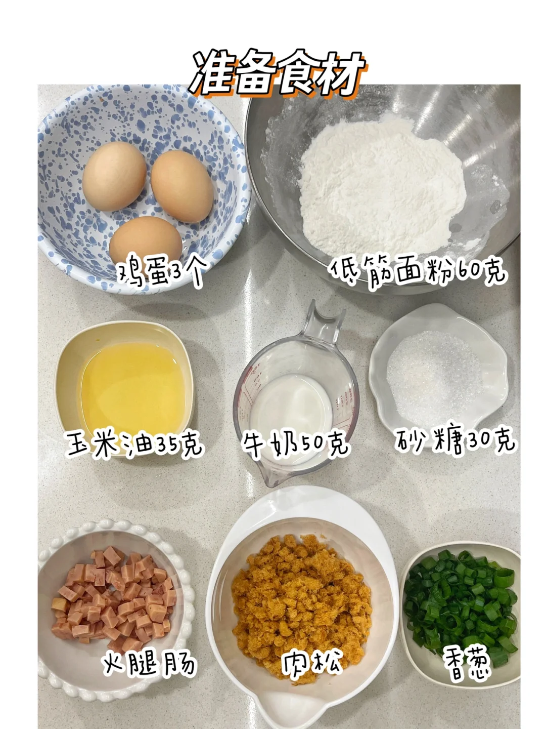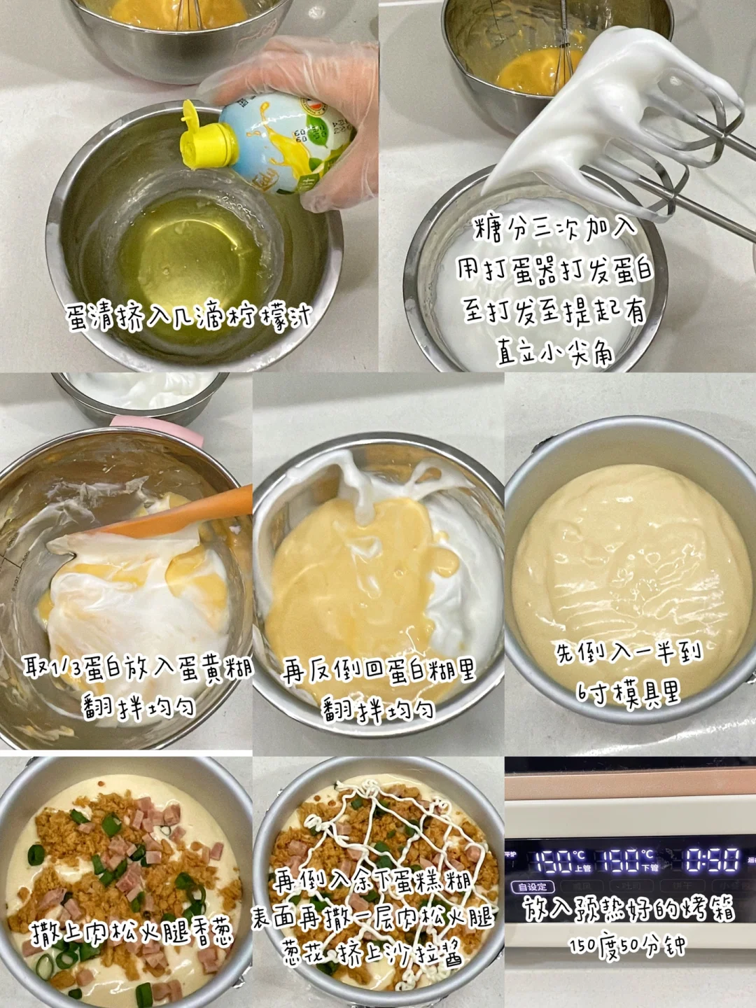 原味的戚风蛋糕吃多了,可以试试今天这个香葱火腿肉松口味,保证吃一次就爱上[偷笑R] ✅准备食材: 鸡蛋3个、低粉60克、玉米油35克、牛奶50克、砂糖30克、香葱肉松火腿 适量. ✅制作方法:可参考图片 ✅烘烤时间:烤箱提前预热,上下管150度50分钟. (❗️具体烘烤时间可根据自家烤箱脾性相应调整)