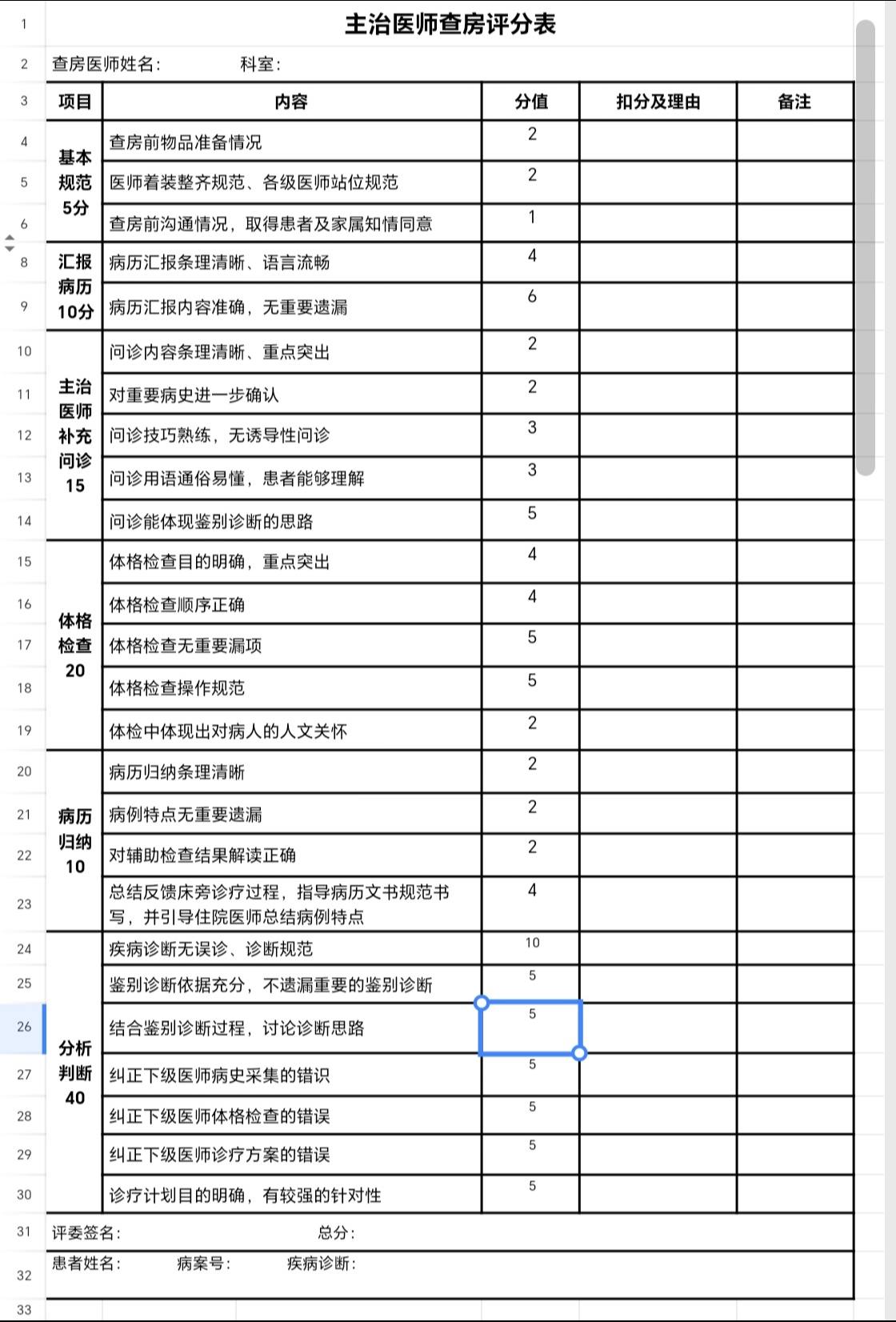 主治医师查房评分表。