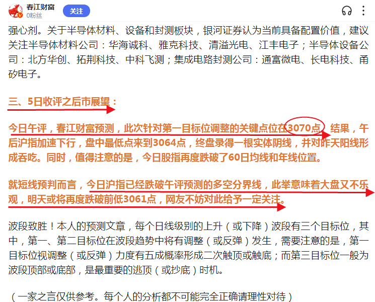 5日午评,春江财富预测关键点位在3070点。结果,大盘7日在抵达3065点后便遇阻回落,而该高点与春江财富预测关键点位误差仅5点。