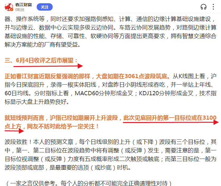 4日收评,春江财富预测第一目标位在3100点。结果,大盘在冲高至3095点便遇阻回落,而该高点与春江财富预测第一目标位误差仅5点;