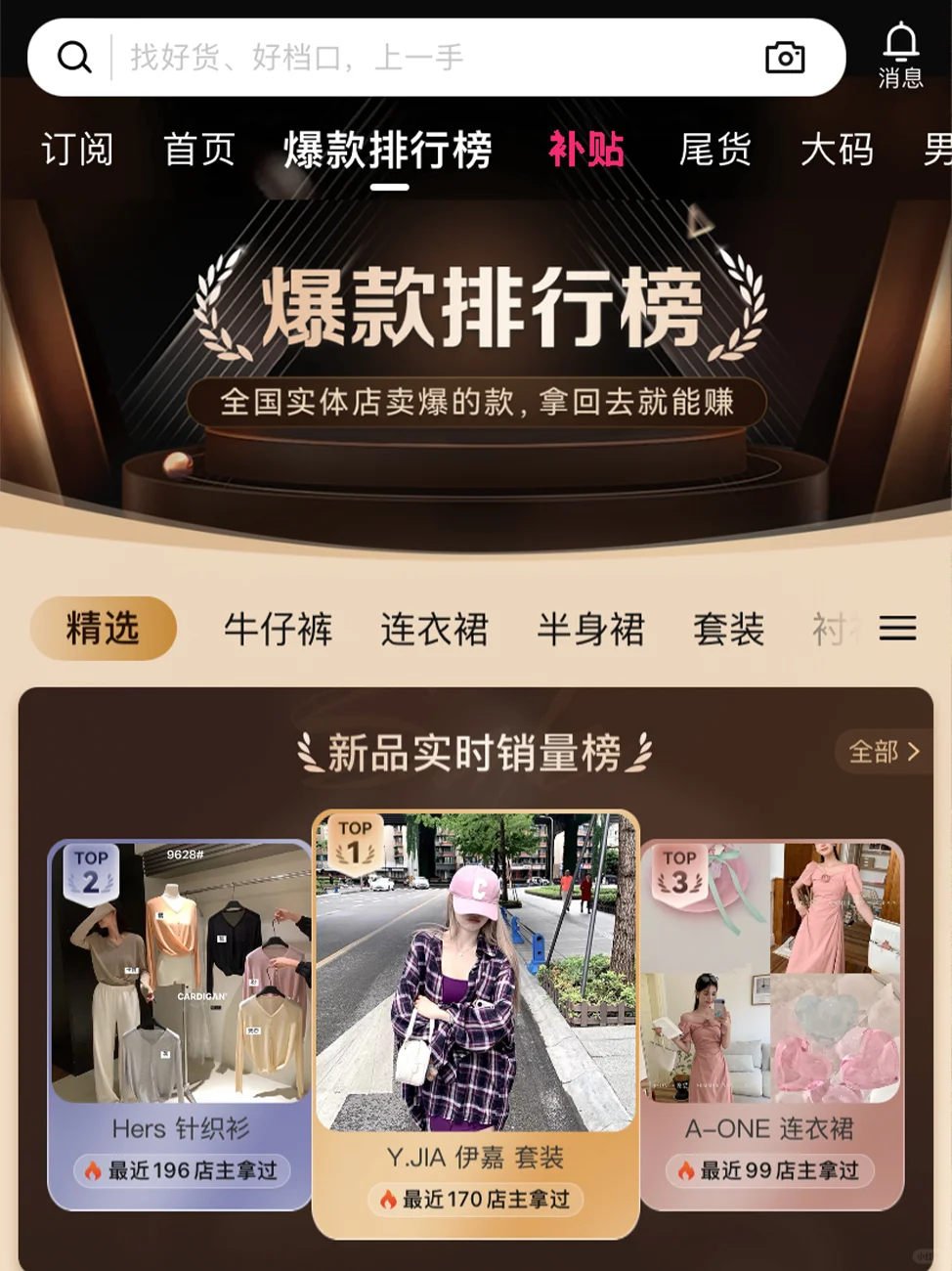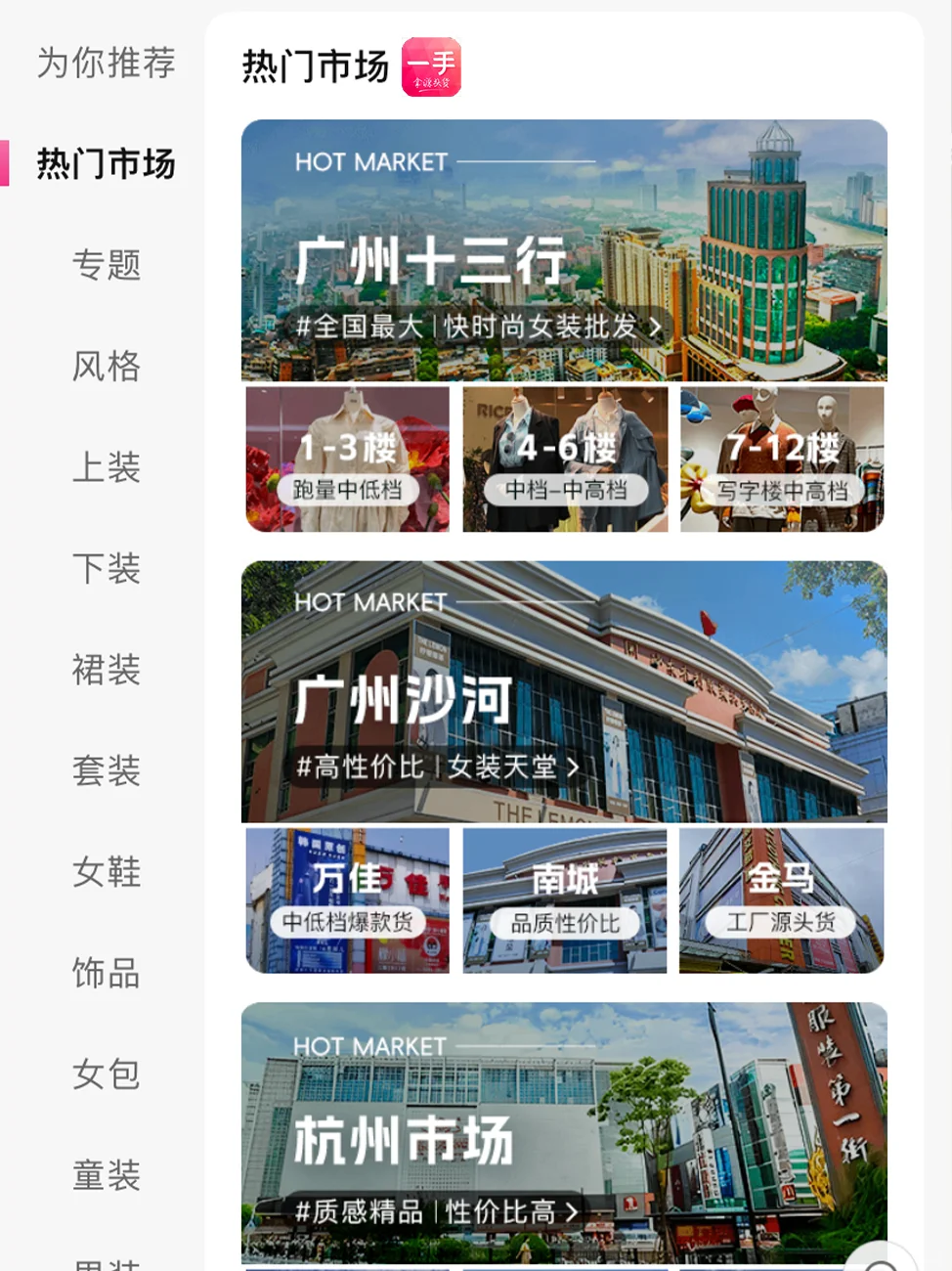 我也从很多国内商家那边收集了一些拿货渠道,例如:广州十三行、杭州市场和濮院市场等等。这些都是大伙线下拿货的地方,因为距离的原因现在线下拿货的也越来越少。线上拿货也变的更有优势了,现在大家都是通过“一手”快速拿样,然后对比商家产品质量,一手服装的种类也非常多,并且分类很清晰(如图4)。所以大家可以快速拿货,既节约了路程时间,也可以拿到比线下实体门店更优惠的价格。最重要的是“一手”上的服装种类非常多,最火爆的童装款式也是非常丰富,还其实一手还能帮你快速筛选出当下热门产品(如图5),让你提前抓出人们档口。加速你的爆单几率!