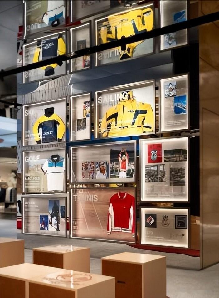 在此区域,两面鞋墙集中陈列了FILA鞋履产品体系 —— 运动鞋墙衔接专业运动区,另一侧的生活鞋墙则聚焦多元生活场景。老爹鞋、菁英跑鞋、商务跑鞋再到各类薄底鞋等品类的最新单品在此精心呈现。