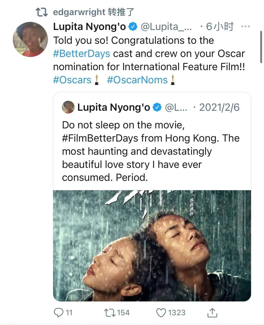 比如2021年《少年的你》入围奥斯卡最佳国际影片提名名单,埃德加·赖特就自发地发推宣传这部电影:
