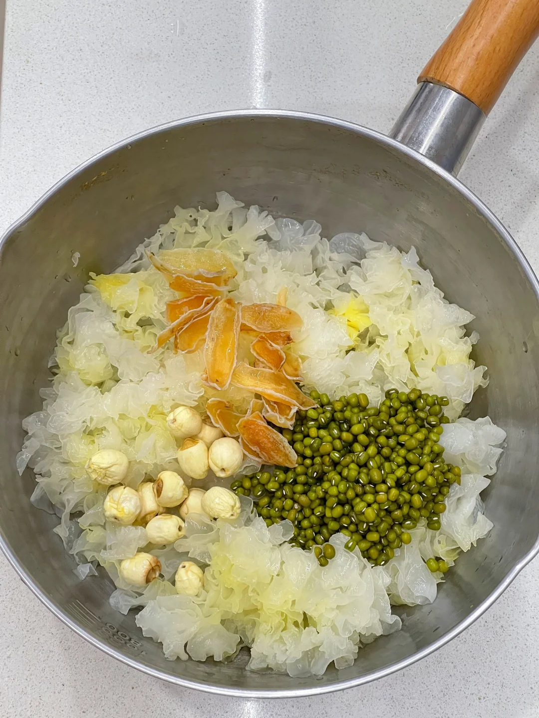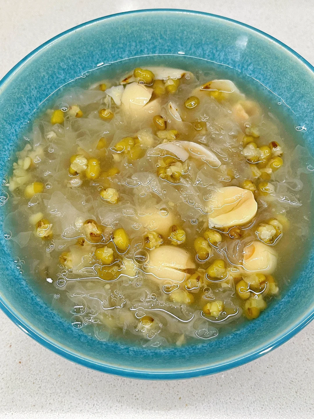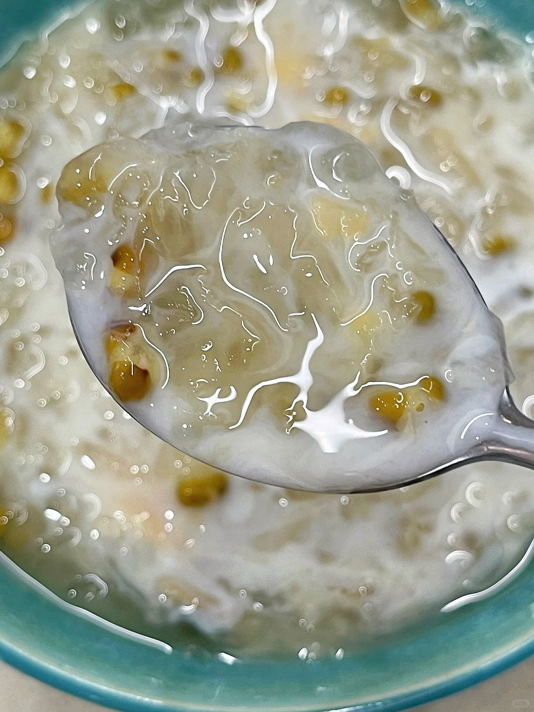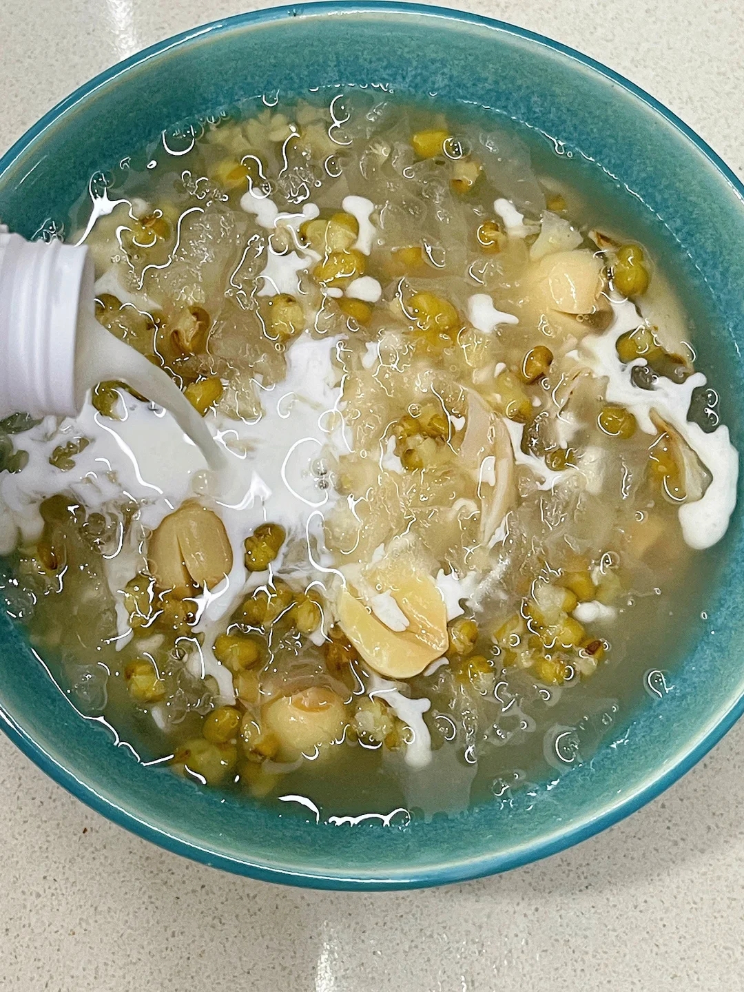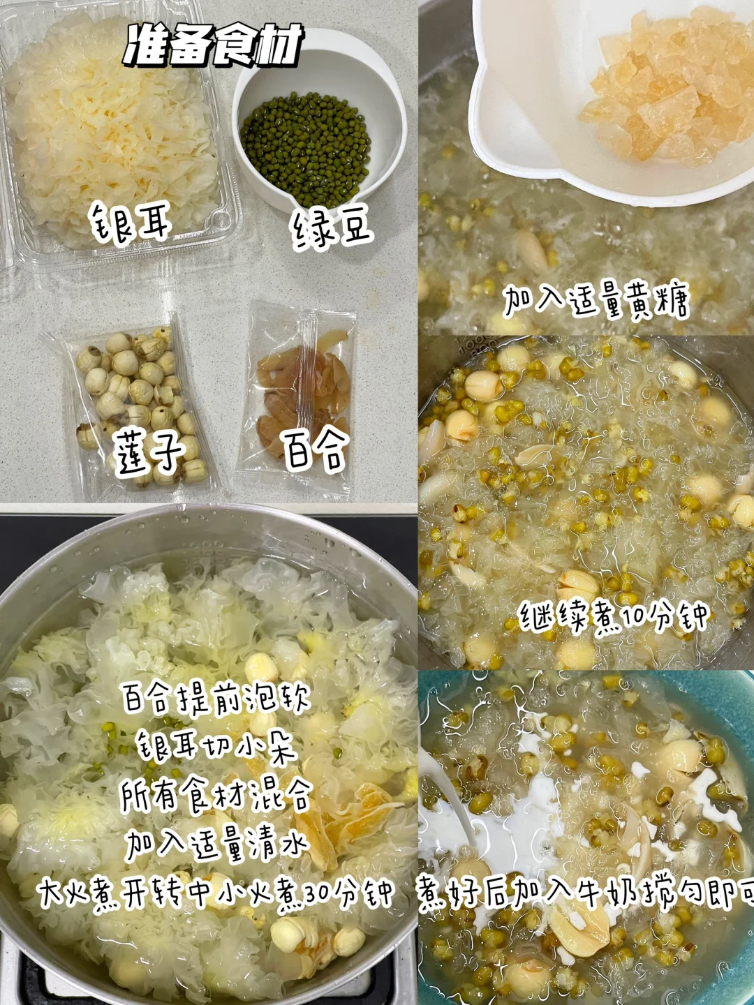 炎炎夏日、绿豆汤又要搞起来了,今天换一个版本,银耳百合莲子绿豆汤,口感软绵,满满的胶感,加上牛奶口味更浓郁,真的推荐大家都去做,巨好喝[赞R] ✅食材:绿豆、银耳、百合、莲子、黄糖、牛奶 ✅制作方法: 🔹干百合提前泡软,银耳我用的鲜的,干的也需要提前泡发好. 🔹银耳剪小朵,银耳+绿豆+百合+莲子 加适量的清水,🔹大火煮开,转中小火煮30分钟. 🔹加入黄糖,继续煮10分钟. 🔹煮好后倒入适量牛奶搅匀即可.