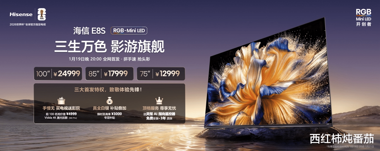 信芯AI画质芯片H7,首创三维光色同控技术,毫秒级同步调控三原色光的强度与配比,支持3x10240级精准分区控制,1个彩色分区的控制精度超越传统3个控光分区;最高配备9360个控光控色分区,配合108bits控色精度,色准ΔE<1,达到专业显示器级别,满足影视创作、高端游戏等严苛场景需求。","inline-dir:\"ltr\""],[20,"\n","24:\"NkUF\"|direction:\"ltr\"|linespacing:\"115\""],[20," ","inline-dir:\"ltr\""],[20,{"gallery":"https://uploader.shimo.im/f/x584nyTwaNBsCkE4.png!thumbnail"},"29:0|30:0|3:\"1270\"|4:\"auto\"|crop:\"\"|frame:\"none\"|ori-height:\"508\"|ori-width:\"1270\""],[20,"\n","24:\"Kr9n\"|direction:\"ltr\"|linespacing:\"115\""],[20,"硬核旗舰!海信E8S满配性能击穿玩家预期","8:1|inline-dir:\"ltr\""],[20,"\n","24:\"oNwi\"|7:1|direction:\"ltr\"|linespacing:\"115\""],[20,"\t作为影游旗舰,海信E8S以“全能六边形战士”姿态,将全场景体验拉至顶配水准,适配家庭观影、高端电竞等多元需求。屏幕标配黑曜屏Pro,1.8%超低反射率可有效隔绝环境光干扰,彻底告别“窗帘依赖症”,即便正午阳光直射,画面依旧深邃通透,无需刻意调节环境光即可享受沉浸式观看。同时支持杜比视界第二代技术,XDR Pro 5300nits峰值亮度,让暗部细节清晰可辨,亮部峰值不刺眼,还原影片原生光影张力。","inline-dir:\"ltr\""],[20,"\n","24:\"clbO\"|direction:\"ltr\"|linespacing:\"115\""],[20," ","inline-dir:\"ltr\""],[20,{"gallery":"https://uploader.shimo.im/f/4vuL5zagJbSIiru0.png!thumbnail"},"29:0|30:0|3:\"1268\"|4:\"auto\"|crop:\"\"|frame:\"none\"|ori-height:\"507\"|ori-width:\"1268\""],[20,"\n","24:\"jYsm\"|direction:\"ltr\"|linespacing:\"115\""],[20,"\t音质方面,搭载法国顶奢帝瓦雷4.2.2多声道声学系统,270W超强功率搭配7.6L巨型音腔,实现低至45Hz澎湃低音,无需外接回音壁即可构建影院级三维立体声场,观影时声临其境,游戏中能精准捕捉脚步声、枪声方位,助力电竞操作升级。","inline-dir:\"ltr\""],[20,"\n","24:\"BnZw\"|direction:\"ltr\"|linespacing:\"115\""],[20," ","inline-dir:\"ltr\""],[20,{"gallery":"https://uploader.shimo.im/f/KwrC5R6xRaCNxVbf.png!thumbnail"},"29:0|30:0|3:\"1268\"|4:\"auto\"|crop:\"\"|frame:\"none\"|ori-height:\"507\"|ori-width:\"1268\""],[20,"\n","24:\"VxQi\"|direction:\"ltr\"|linespacing:\"115\""],[20,"\t游戏性能直击核心需求,配备原生4K 180Hz高刷屏幕,支持330Hz疾速刷新,较单色背光的QD-Mini LED主流144Hz刷新率提升25%,高速甩枪、赛车追逐等场景无拖影、无撕裂,画面流畅度拉满。四路满血HDMI 2.1接口支持48Gbps带宽,4K 180Hz模式下画面输出延迟低至4.7ms,达到专业电竞水准。","inline-dir:\"ltr\""],[20,"\n","24:\"EXlo\"|direction:\"ltr\"|linespacing:\"115\""],[20," ","inline-dir:\"ltr\""],[20,{"gallery":"https://uploader.shimo.im/f/5aZnFcmwqVf46aZ3.png!thumbnail"},"29:0|30:0|3:\"1268\"|4:\"auto\"|crop:\"\"|frame:\"none\"|ori-height:\"507\"|ori-width:\"1268\""],[20,"\n","24:\"iQRM\"|direction:\"ltr\"|linespacing:\"115\""],[20,"\t行业首创游戏妙控台可AI智能识别游戏类型,自动匹配优化参数;作为《影之刃零》全球官方合作伙伴,更搭载专属定制游戏模式,一键解锁原生画质与手感。","inline-dir:\"ltr\""],[20,"\n","24:\"sv9R\"|direction:\"ltr\"|linespacing:\"115\""],[20," ","inline-dir:\"ltr\""],[20,{"gallery":"https://uploader.shimo.im/f/zslRp5EJtsOfEO76.png!thumbnail"},"29:0|30:0|3:\"1268\"|4:\"auto\"|crop:\"\"|frame:\"none\"|ori-height:\"507\"|ori-width:\"1268\""],[20,"\n","24:\"lc86\"|direction:\"ltr\"|linespacing:\"115\""],[20,"\t同时新上光影妙控台,系统开放51项精细参数调节,支持扫码导入社区大神调校配置,兼顾普通用户便捷操作与发烧友专业需求。","inline-dir:\"ltr\""],[20,"\n","24:\"yBaV\"|direction:\"ltr\"|linespacing:\"115\""],[20,"\t设计上,机身薄至44mm,全平一体化背部无凸起,挂墙时如同墙面艺术画,不破坏家居美学;背部电影胶片矩阵纹理与胜利战鼓低音炮设计,精准彰显影游旗舰基因,兼顾颜值与实用性。","inline-dir:\"ltr\""],[20,"\n","24:\"jGIY\"|direction:\"ltr\"|linespacing:\"115\""],[20," ","inline-dir:\"ltr\""],[20,{"gallery":"https://uploader.shimo.im/f/tpGQvIOhBl9dKFPK.png!thumbnail"},"29:0|30:0|3:\"1268\"|4:\"auto\"|crop:\"\"|frame:\"none\"|ori-height:\"507\"|ori-width:\"1268\""],[20,"\n","24:\"8bKQ\"|direction:\"ltr\"|linespacing:\"115\""],[20,"降维竞争!与单色背光量子点Mini LED同档定价开售","8:1|inline-dir:\"ltr\""],[20,"\n","24:\"0rl8\"|7:1|direction:\"ltr\"|linespacing:\"115\""],[20,"\t为推动RGB-Mini LED技术普及,海信E8S给出力度空前的定价策略,直接将旗舰级彩色背光RGB-Mini LED产品拉至与单色背光量子点Mini LED同档价位。其中75吋官方指导价12999元、85吋17999元、100吋24999元,首发期间福利加码:首批用户可享1500元专属补贴,叠加国家补贴后综合优惠至高3000元,最终75吋版本仅需9999元、85吋14999元、100吋21999元即可入手,让更多家庭以单色背光旗舰产品的预算,升级享受到代际领先的RGB-Mini LED 体验。","inline-dir:\"ltr\""],[20,"\n","24:\"NLne\"|direction:\"ltr\"|linespacing:\"115\""],[20," ","inline-dir:\"ltr\""],[20,{"gallery":"https://uploader.shimo.im/f/LAQpSeF2pSQkDmBj.png!thumbnail"},"29:0|30:0|3:\"1268\"|4:\"auto\"|crop:\"\"|frame:\"none\"|ori-height:\"507\"|ori-width:\"1268\""],[20,"\n","24:\"BdwZ\"|direction:\"ltr\"|linespacing:\"115\""],[20,"\t1月19日20:00,海信E8S已在海信官方商城、京东、天猫、抖音等主流平台正式开售。","inline-dir:\"ltr\""]]" data-copy-origin="https://shimo.im">1月19日,以“海信RGB-Mini LED换代风暴”为主题的2026 RGB-Mini LED影游旗舰E8S新品发布会盛大召开。作为全球RGB-Mini LED技术的开创者与领跑者,海信正式推出影游旗舰E8S系列电视,以RGB彩色背光三原色
