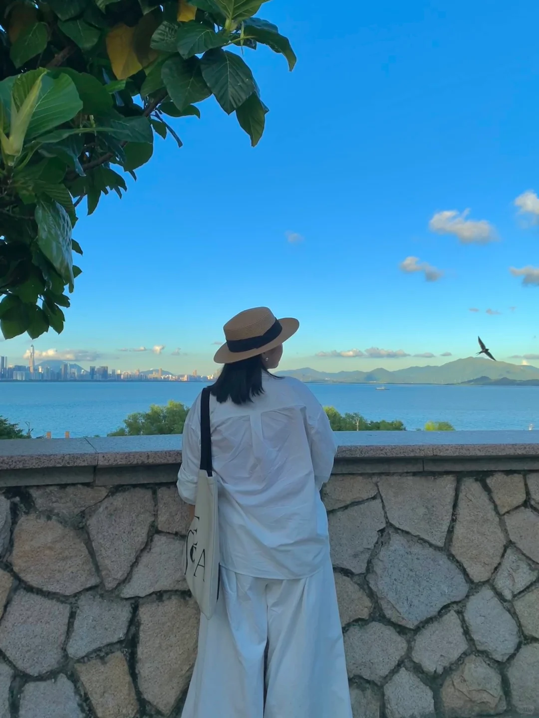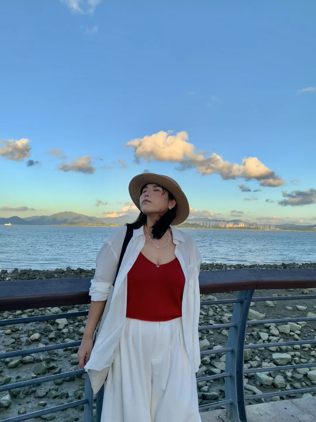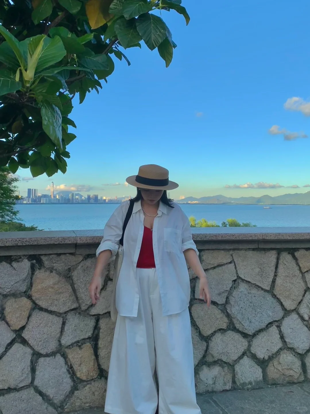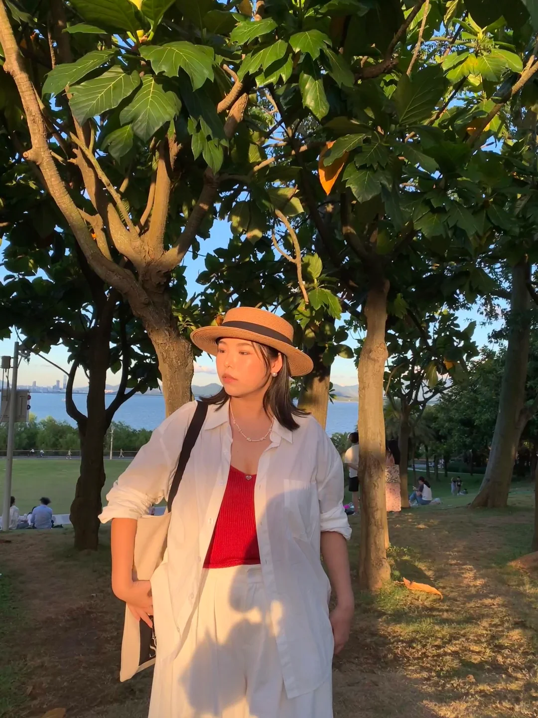 不想浪费晚霞的某个夏日……我们要去公园进行光合作用! 【今日ootd搭配思路】 🐚简单放松的白色衬衫长裤,去迎合植物系的背景,更清爽更有氧气感🧊 🧣point的红色背心是点睛之笔,可以和绿色背景有细微的冲撞 📷 我朋友可太会拍照啦!我在她的镜头里比在现实中好看很多呢🐣