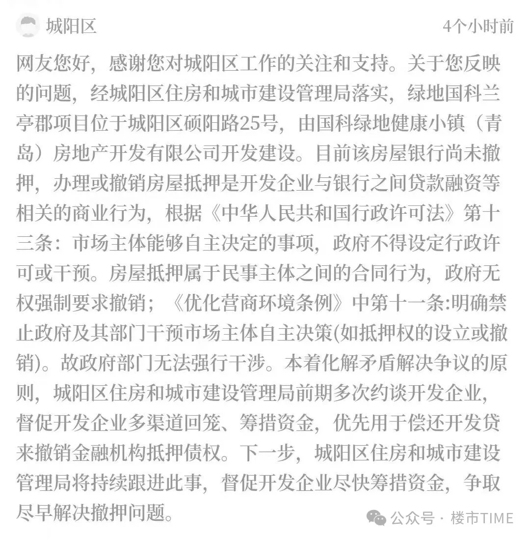 现在的局面是:钱没了,房住进去了,但只要没解押,办不了证,这房子随时可能因为开发商欠债,被法院查封、拍卖。城阳区的回复很“标准”: