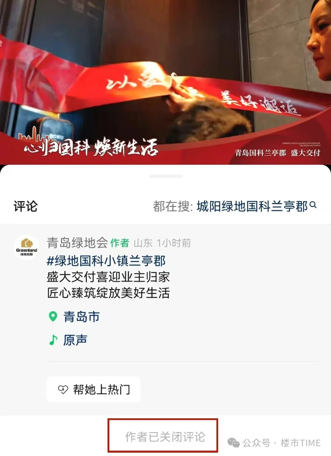 前段时间,绿地国科兰亭郡二期,搞所谓的“盛大交付”。按理说,交付是喜事,应该锣鼓喧天、鞭炮齐鸣,恨不得让全青岛都知道。但绿地干了一件让人极其下头的事——他们在交付的宣传视频中,把评论区给关了。