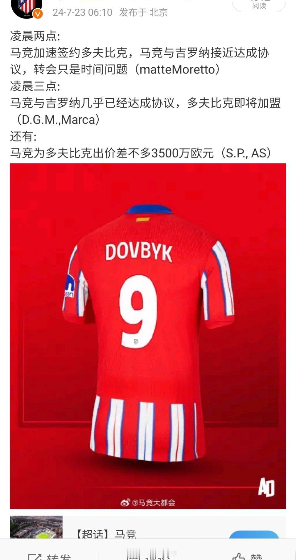 马德里竞技将达到赫罗纳足球俱乐部要求的 4000 万欧元,其中包括浮动条款。