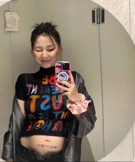 金靖晒孕肚照,她身着黑色针织短袖,穿搭非常时尚,还在孕肚上做了彩绘,状态看上去很不错。