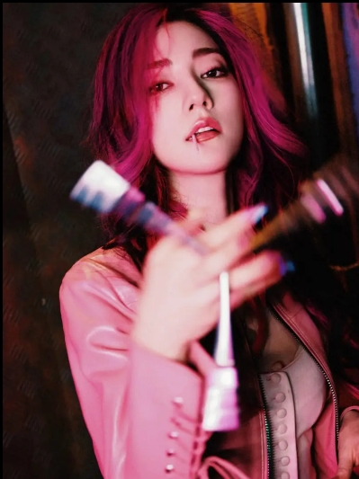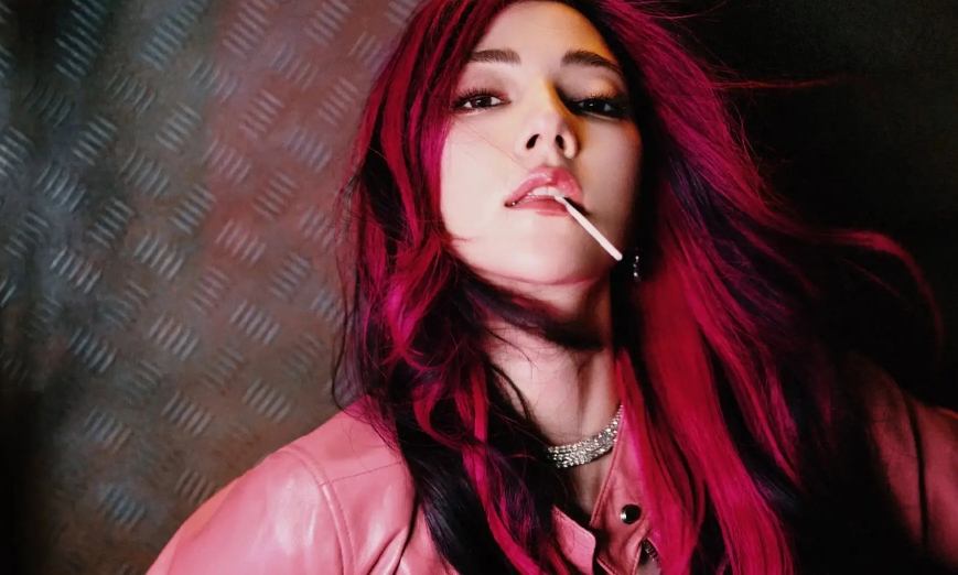 娜然红发粉裤造型妩媚性感 嘴叼棒棒糖撕漫感满满