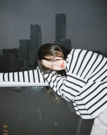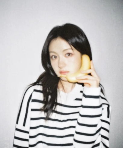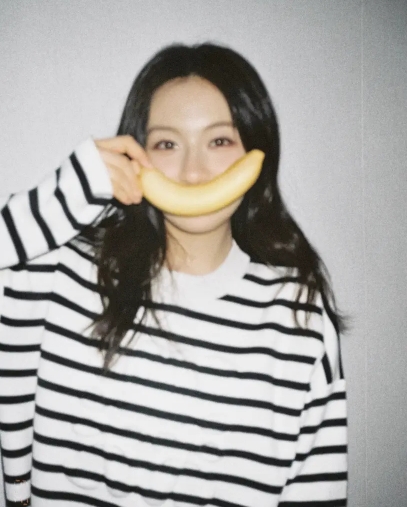 李兰迪身穿黑白条纹衫,举着枕头、水果自拍的李兰迪笑容甜美,看上去元气满满。