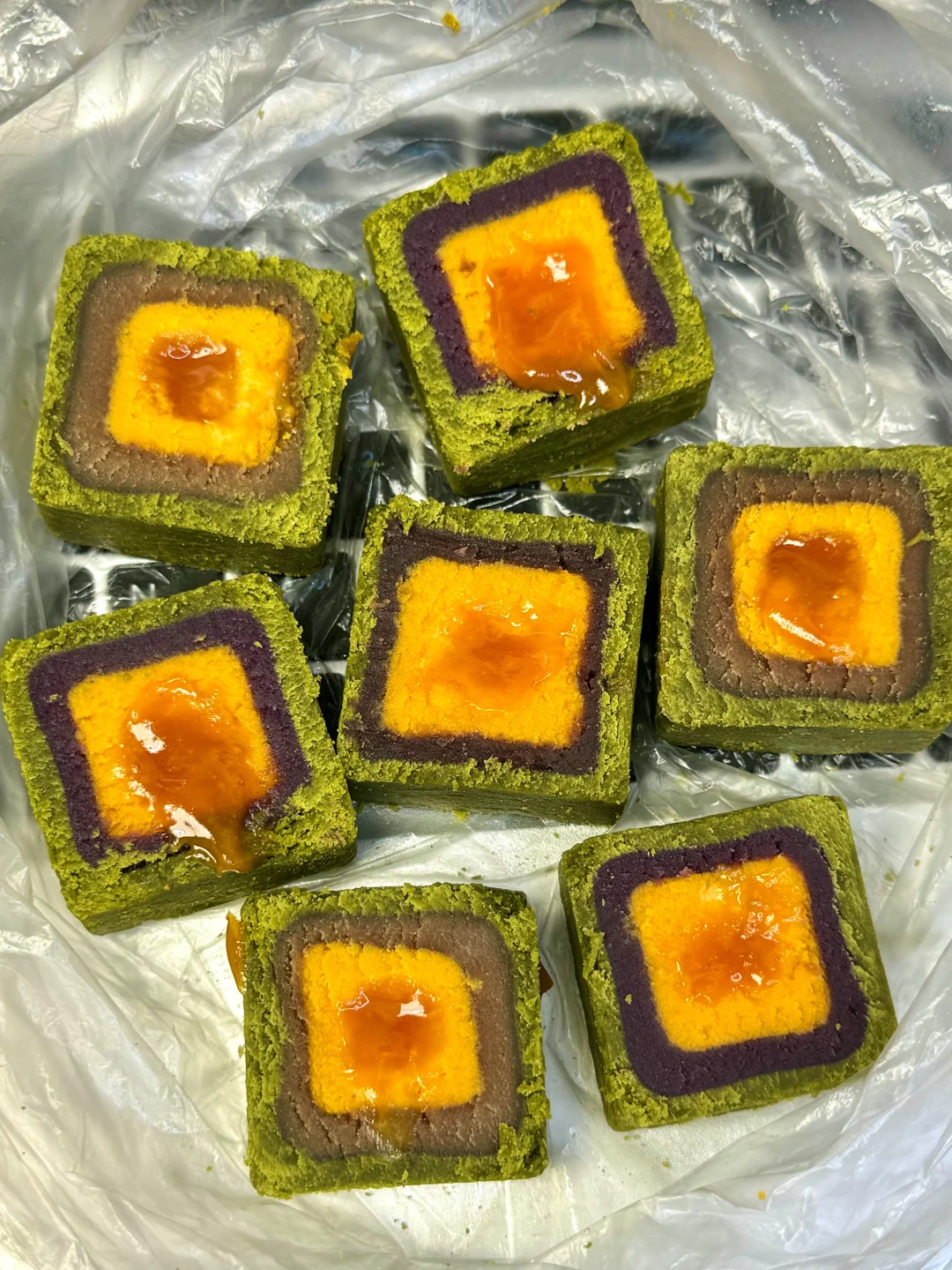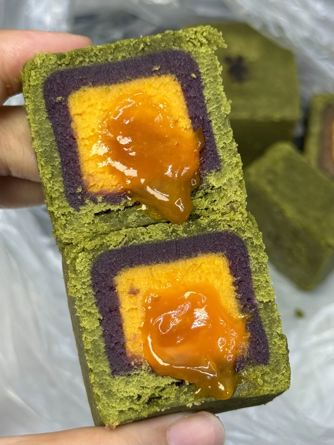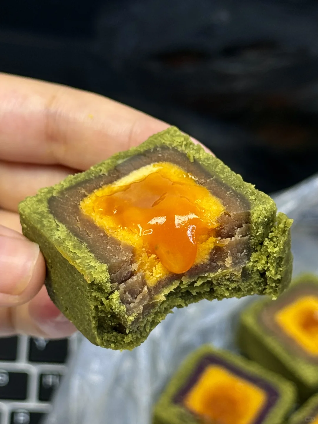 但这个怎么会这么好吃啊🥹 抹茶➕紫薯➕蛋黄流心!! 很高级的抹茶香!入口即化~ 里面的蛋黄流心,流了我一手😅我边吃边吸溜 等中秋节给爷爷奶奶也带一盒这个抹茶月饼!