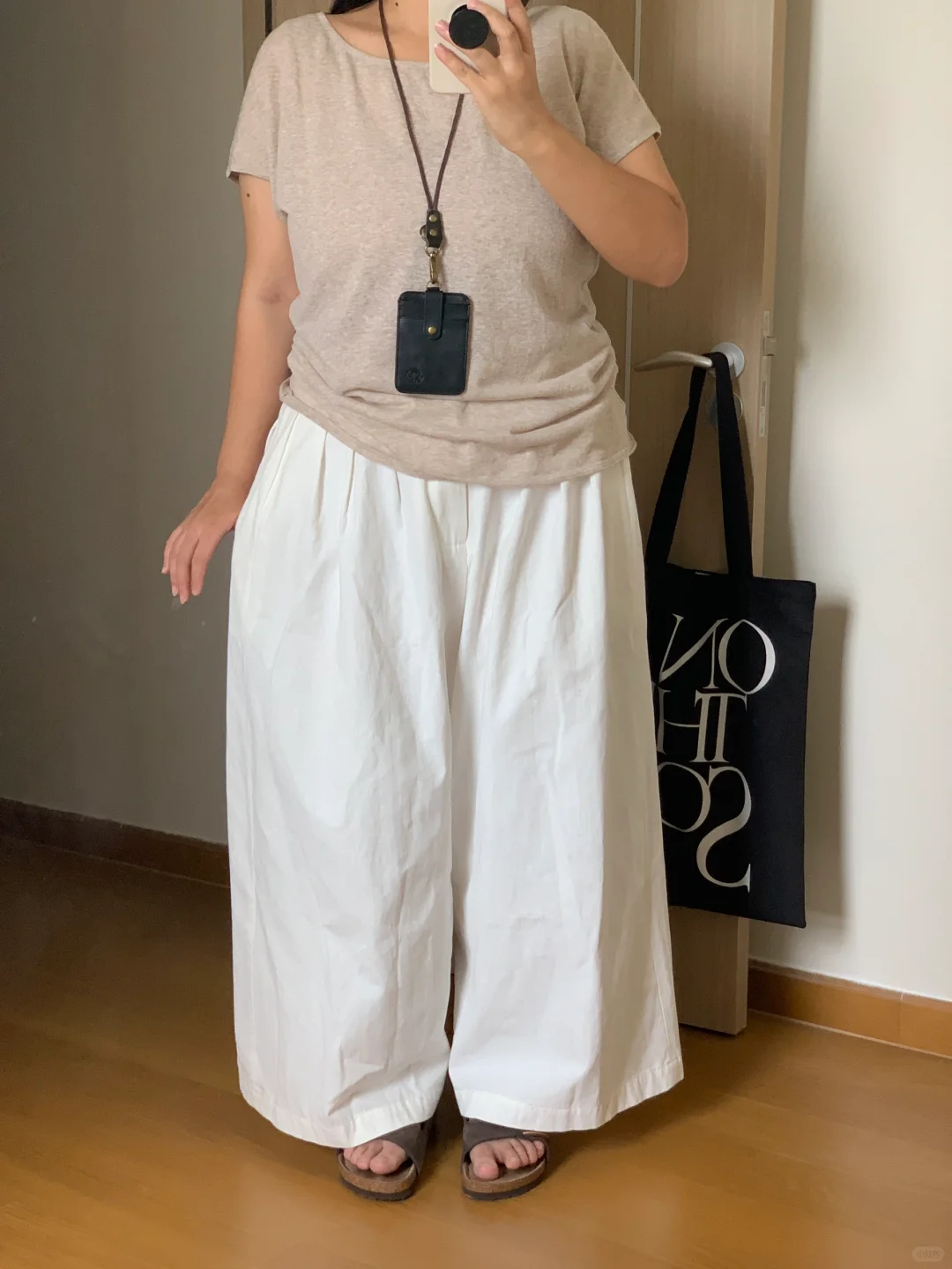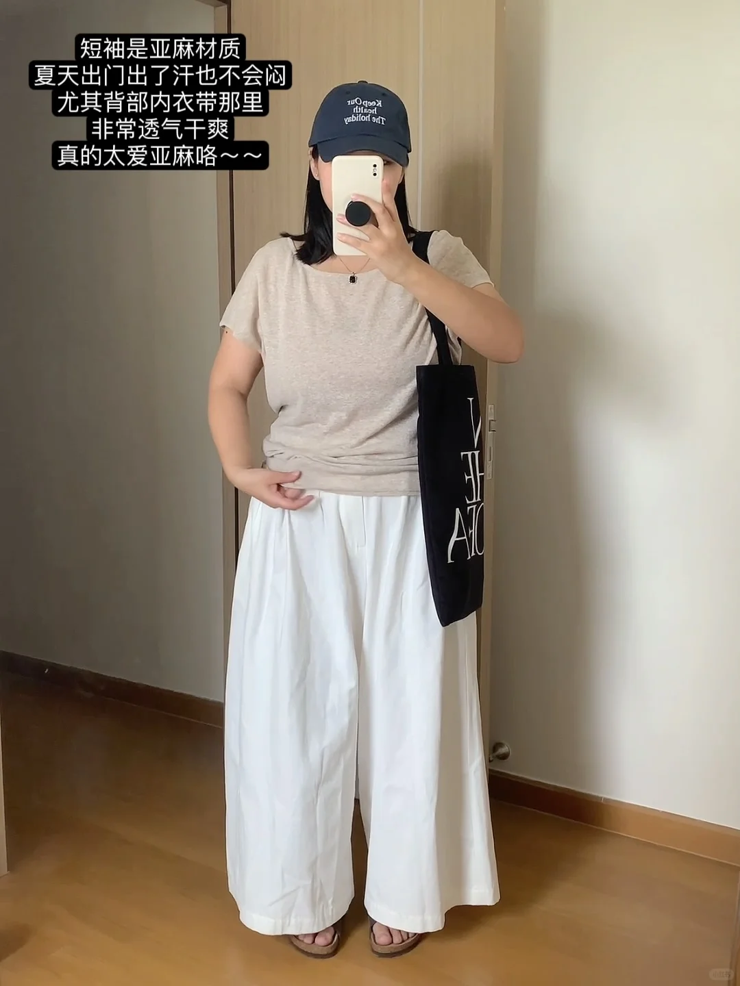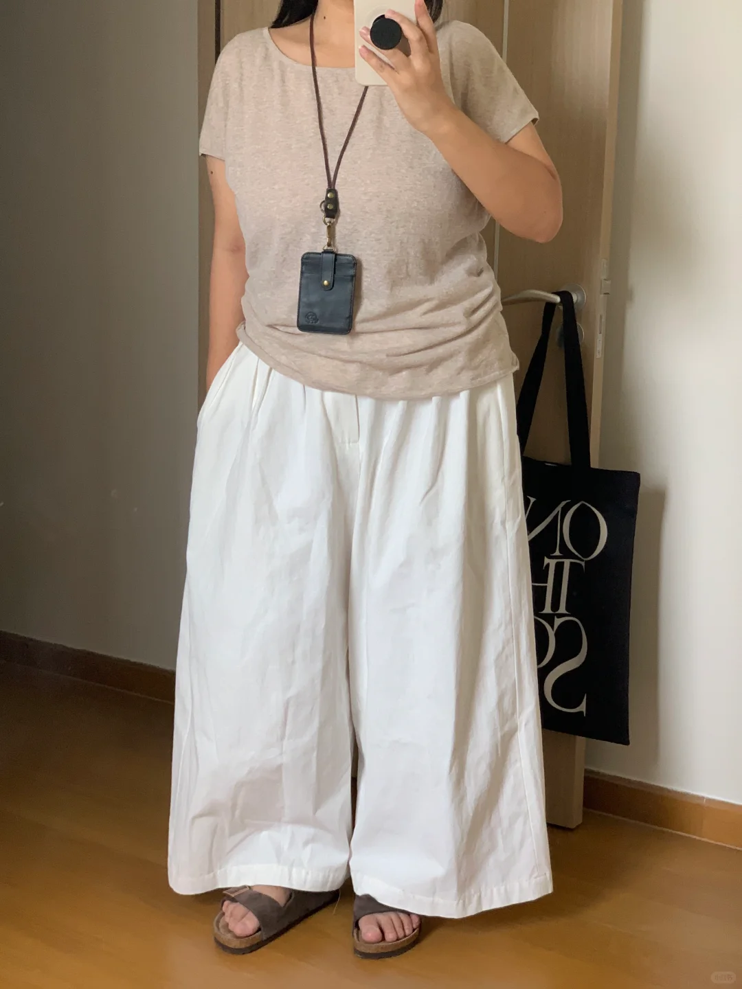 ▪️亚麻短袖➕阔腿白裤子➕勃肯鞋➕大帆布包