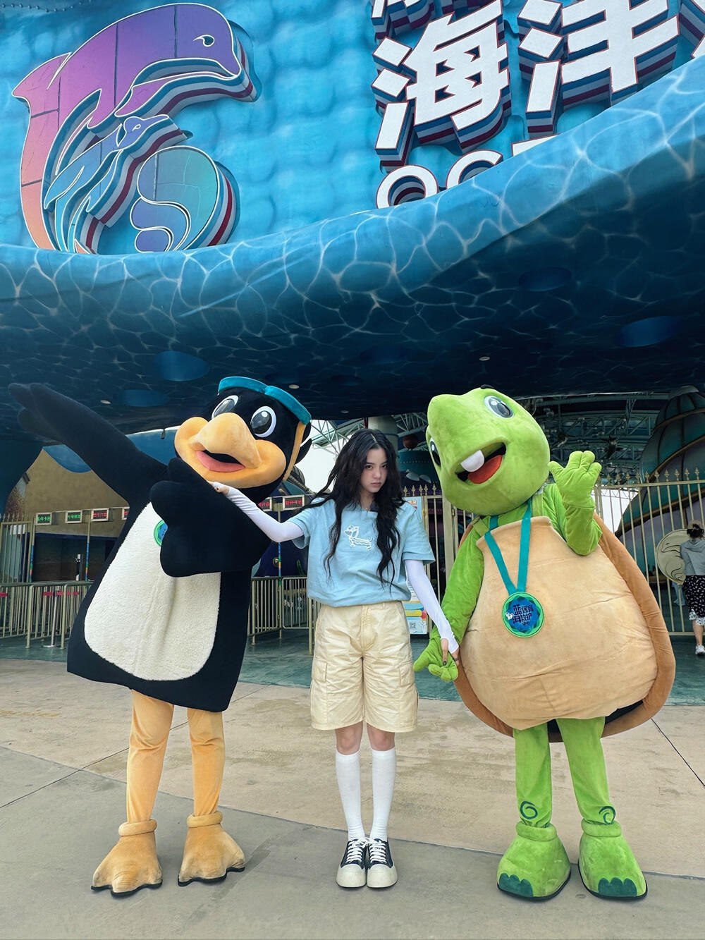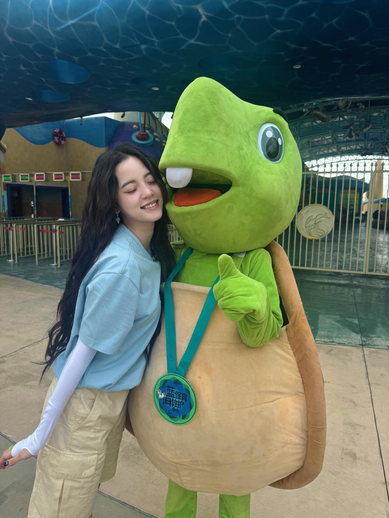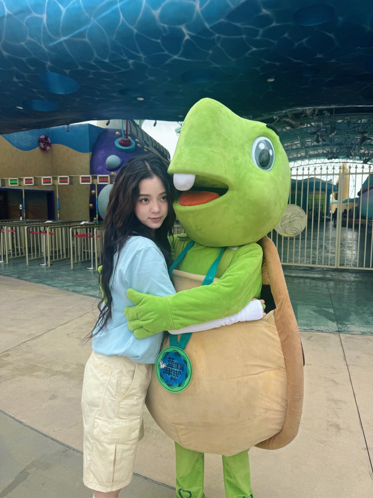 她穿了一件蓝色的短袖T恤,搭配米色的宽松短裤,这短裤比较长,有些中裤感觉。最近的小姑娘们很喜欢穿T恤配这种款式的短裤,休闲时尚又舒适。