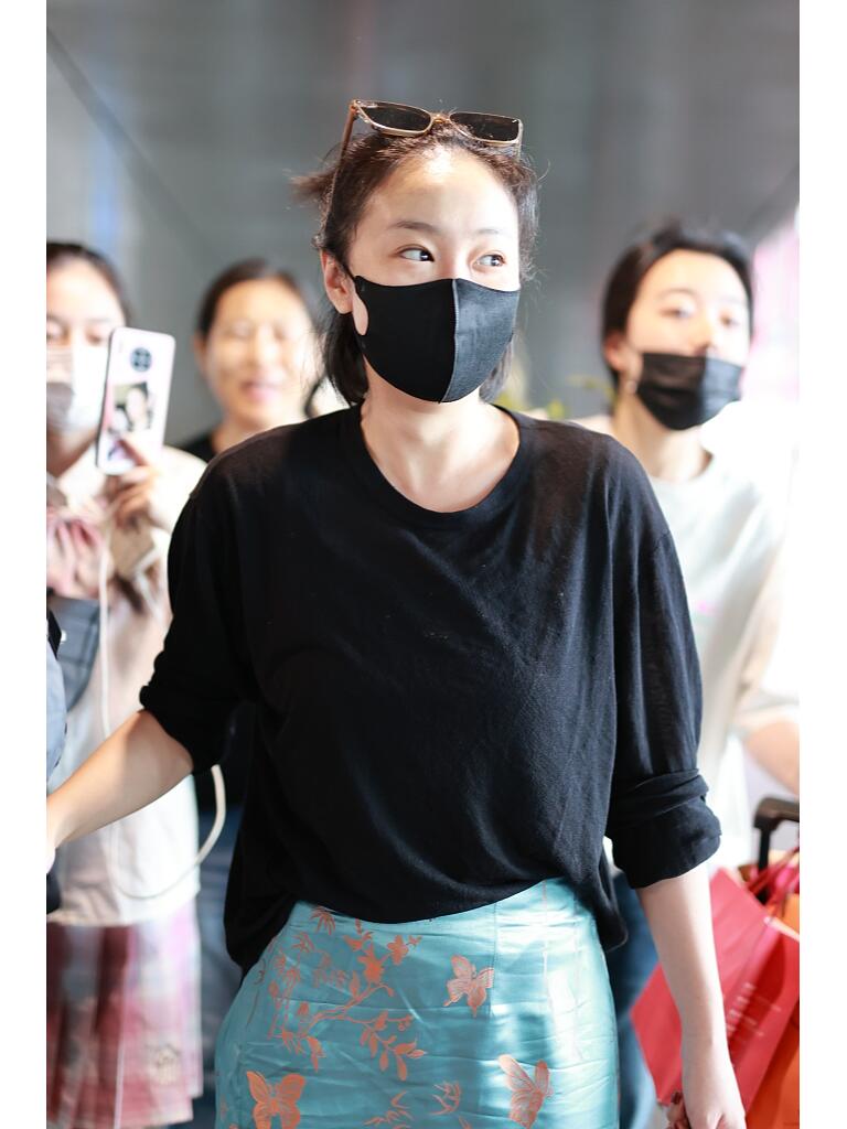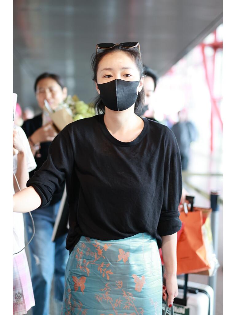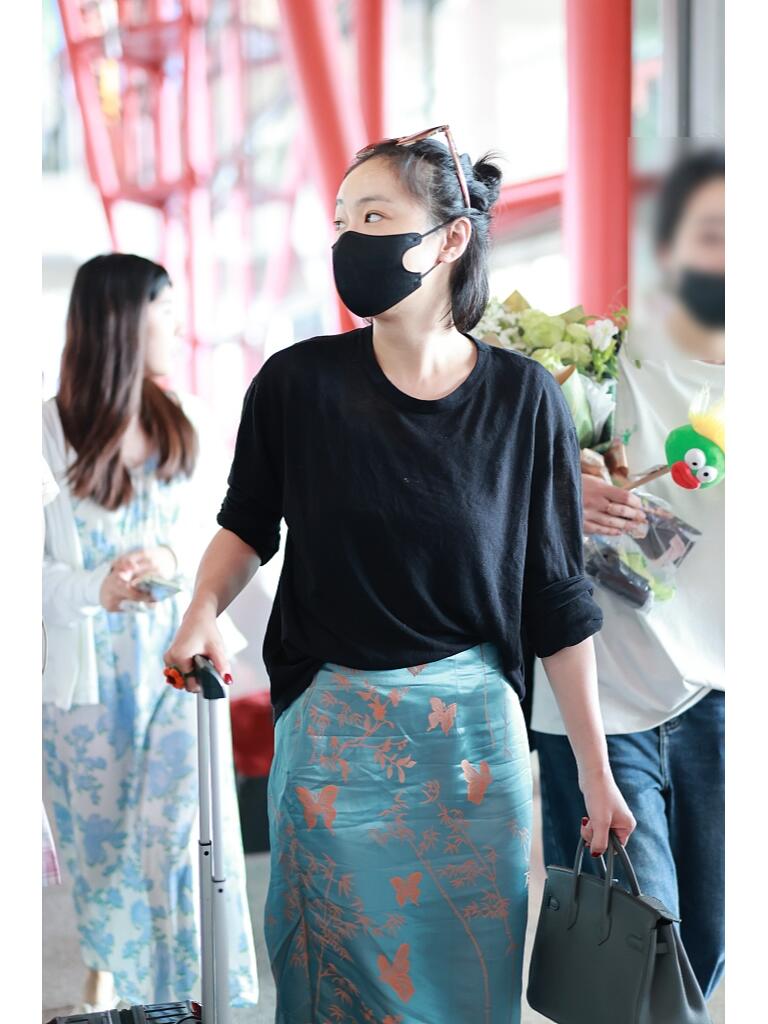 黑色宽松圆领T恤,搭配蓝灰色印花缎面直筒半身裙。这裙子上还有红色的竹叶蝴蝶印花,清爽大气,还蛮有竟境的,这裙子还有些中式风情。脚上穿双黑色的厚底乐福鞋。简单时尚的一套街头穿搭。