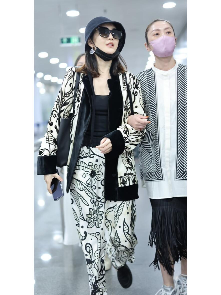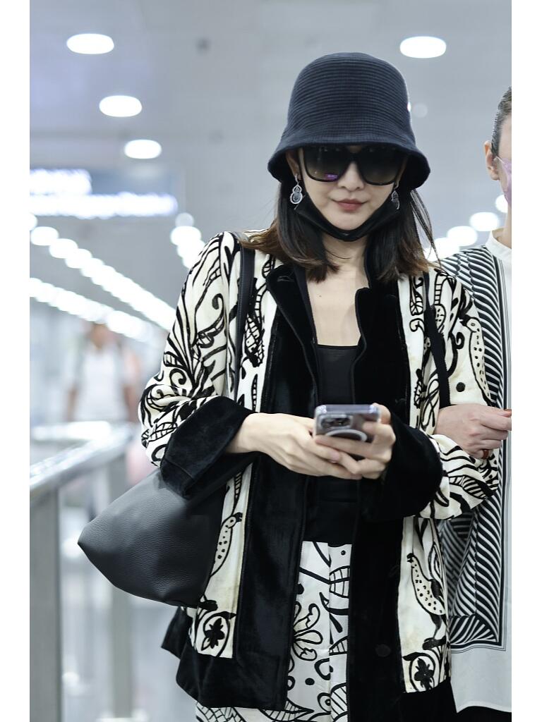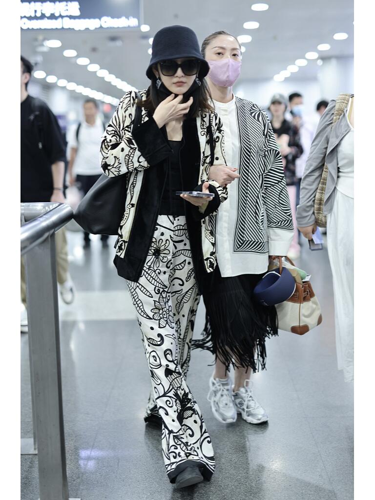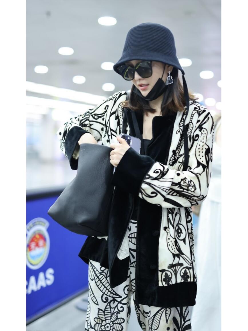 这搭配绝了,黑鞋黑帽,印花套装玩复古,王鸥是要把黑白时尚进行到底嘛?