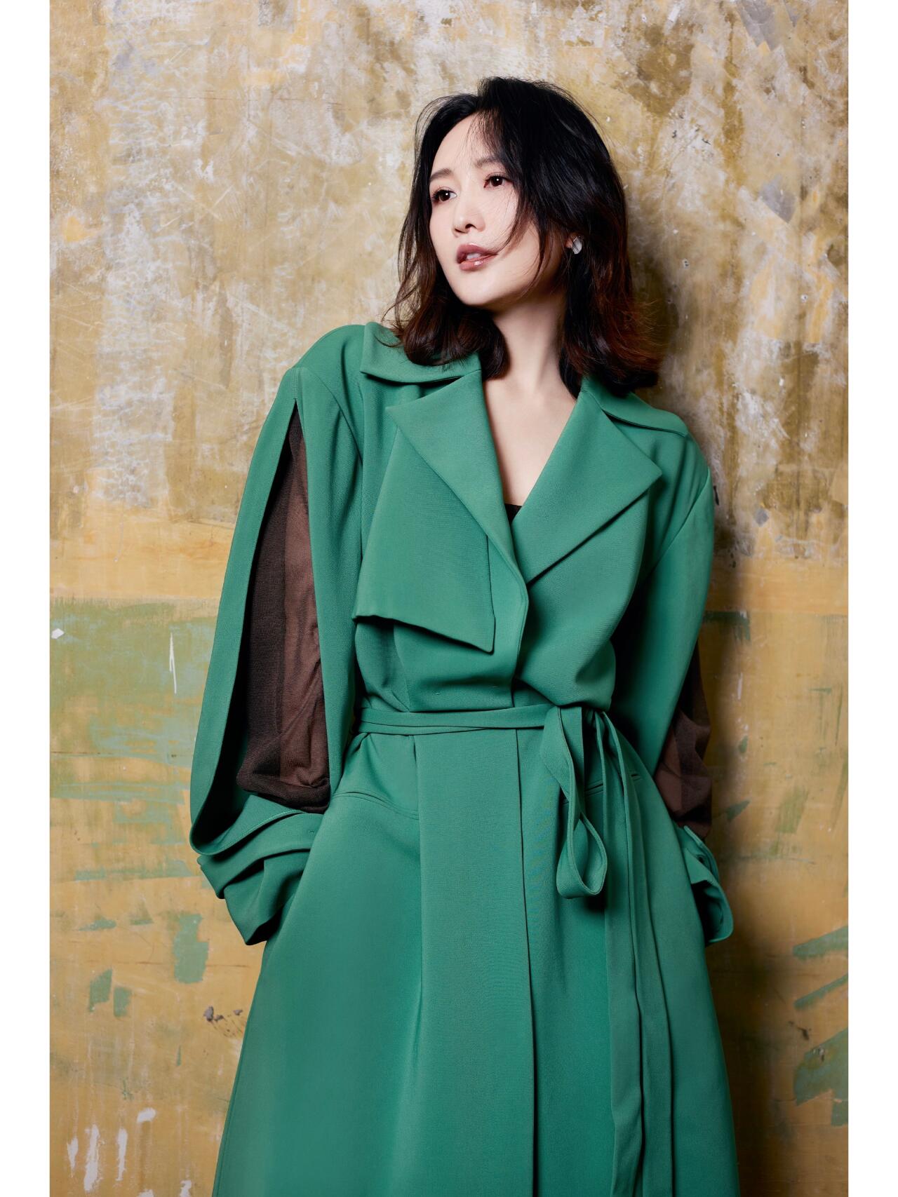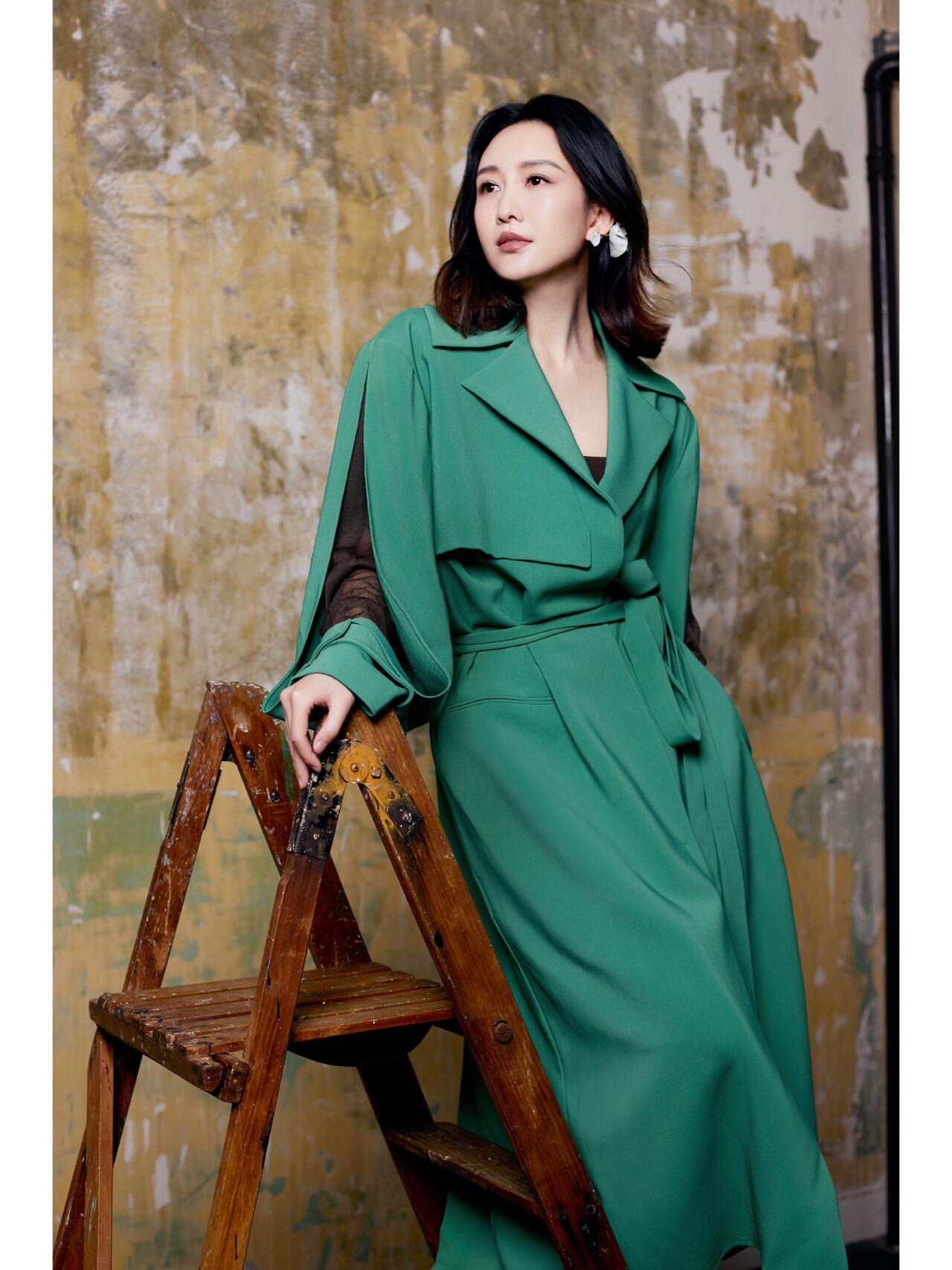 她穿了一件深绿色的长款风衣,把腰带系起来,有连衣裙的感觉。里面穿了黑色V领的打底衫,配一条黑色紧身裤,脚踩白色的高跟凉鞋。大气清爽有气场。