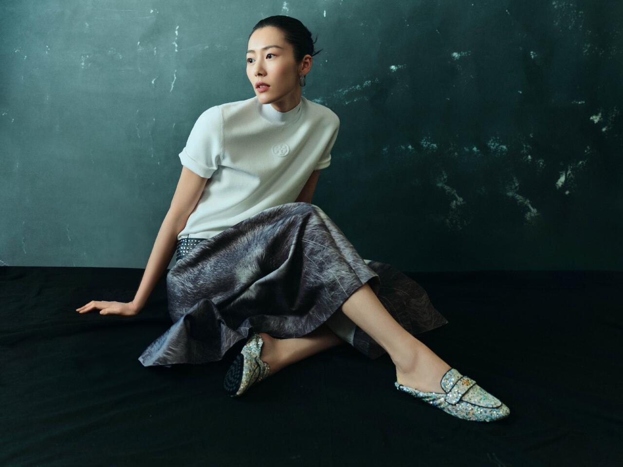 她穿了一件白色的T恤,搭配一条灰色的印花半身裙,脚上穿双银色的乐福拖鞋。清爽时尚又舒适。