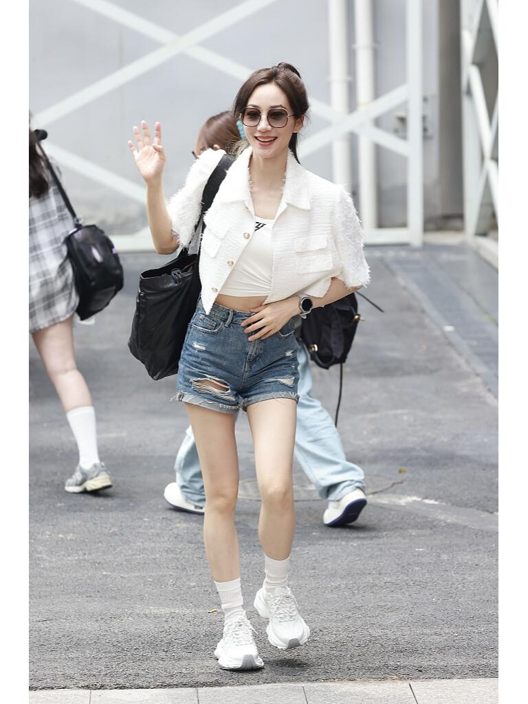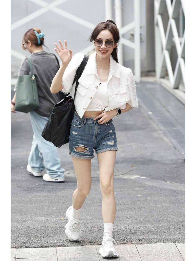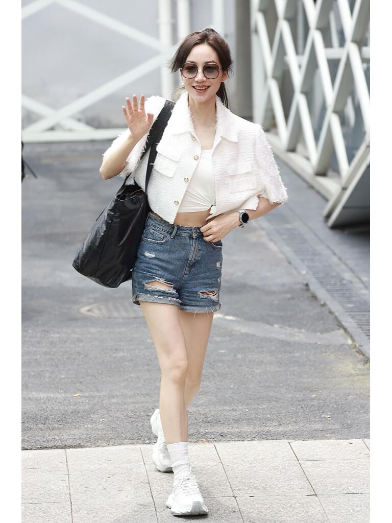 这造型不错呢。扎个高马尾,穿一件白色短款短袖小外套,内搭白色的小背心,配蓝色的牛仔短裤,脚上是小白鞋和短袜子。时尚清爽又帅气,很有活力的街头穿搭。