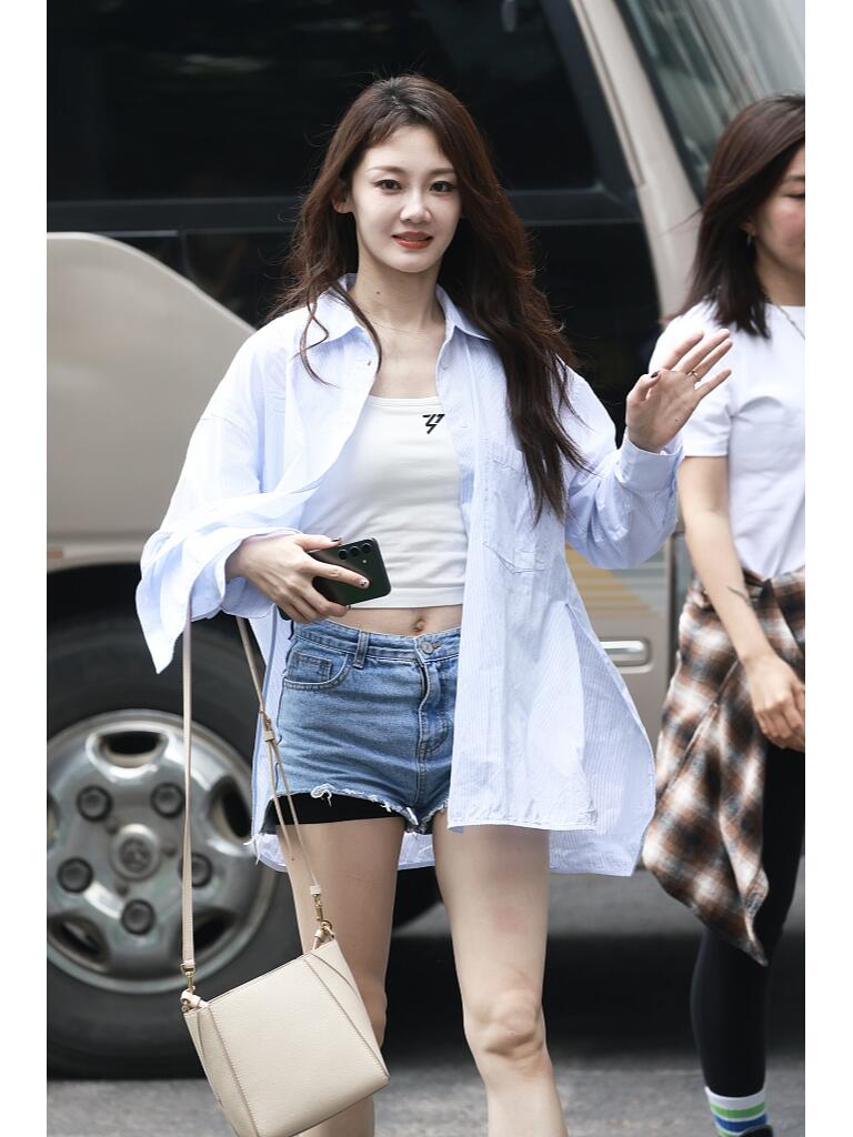 这一头长卷发不错,时髦复古。她穿了一件白色的衬衫,内搭白色的紧身露腰小背心,配蓝色牛仔短裤,这短裤还有黑边露出来,很潮。脚上穿双白色的靴子。简洁清爽有活力。很好看的一套夏日街头穿搭。