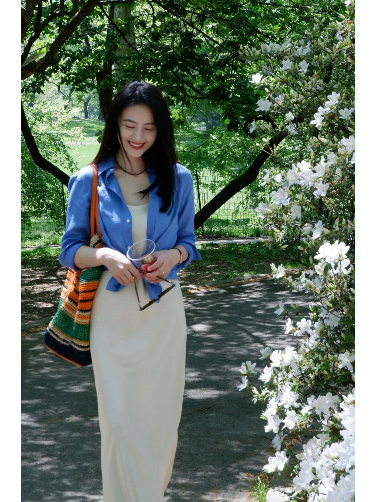 她穿了一件蓝色的牛仔衬衫,内搭一件白色的连衣裙,脚上穿双白色的厚底凉拖鞋。清爽优雅。