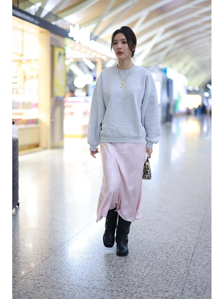 她穿了一件浅灰色的圆领卫衣,搭配一条灰色的半身裙,配黑色的短靴,休闲时尚又随性自在。浅灰色和粉红色组合在一起还蛮养眼的。