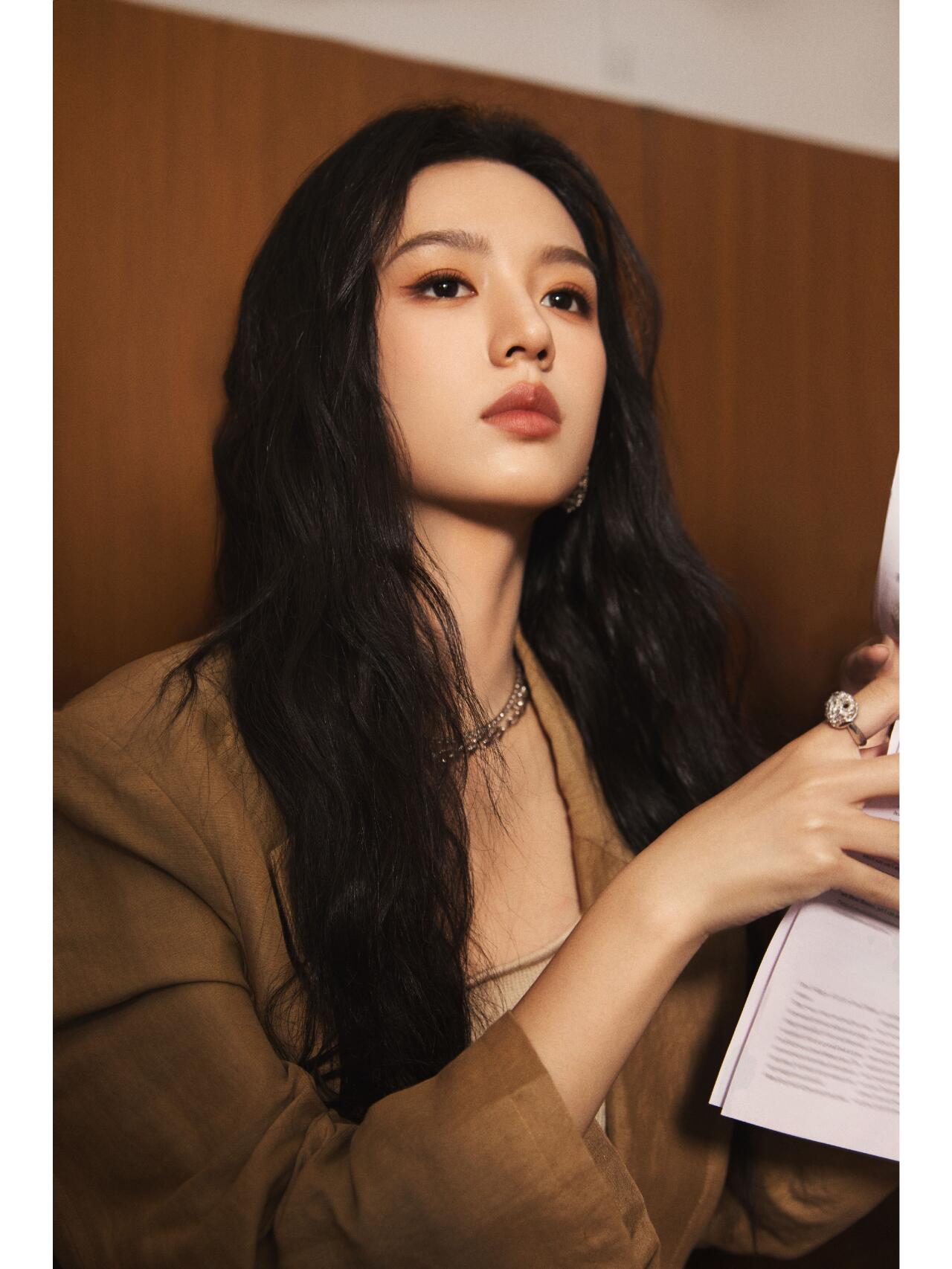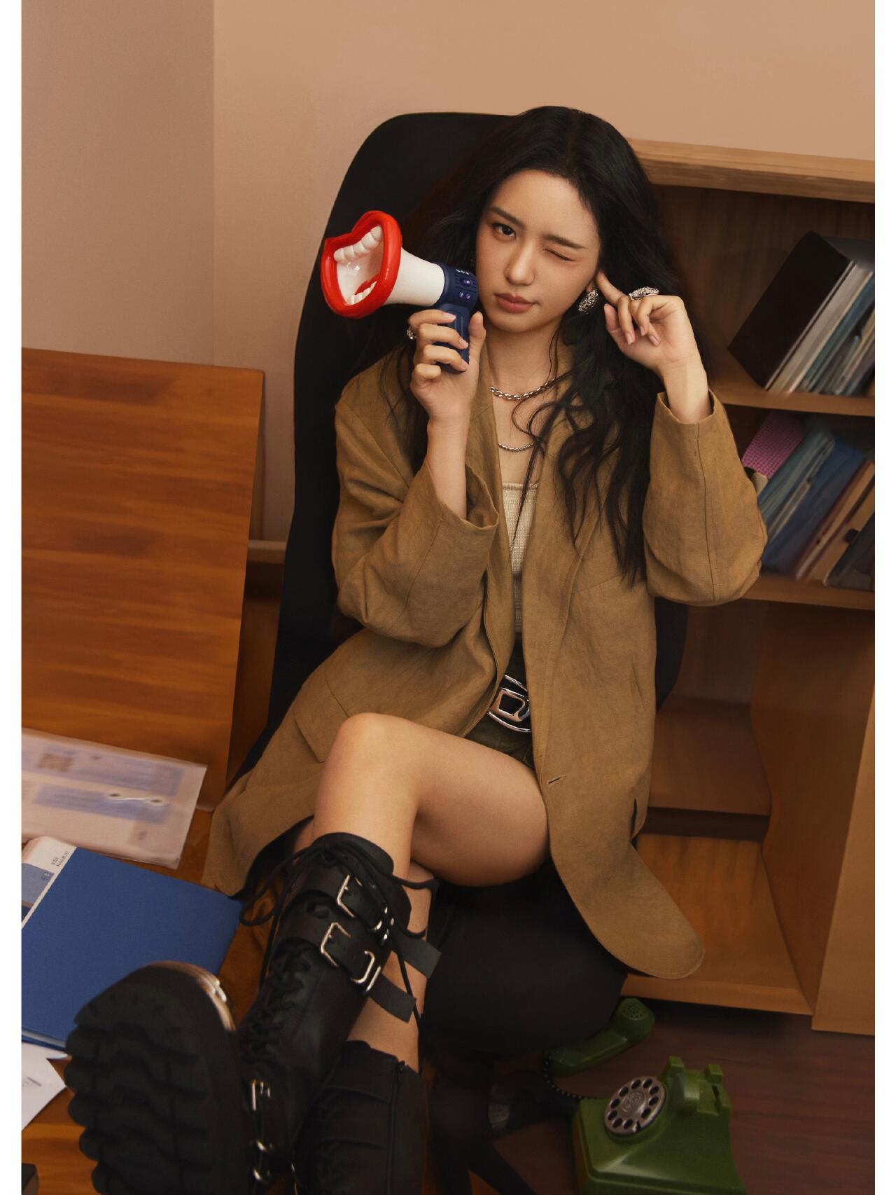 她穿了一件卡其色的长款西装,内搭白色小背心,配蓝色的牛仔短裤,脚上穿双黑色的长靴子。简单大方.还蛮潮的.