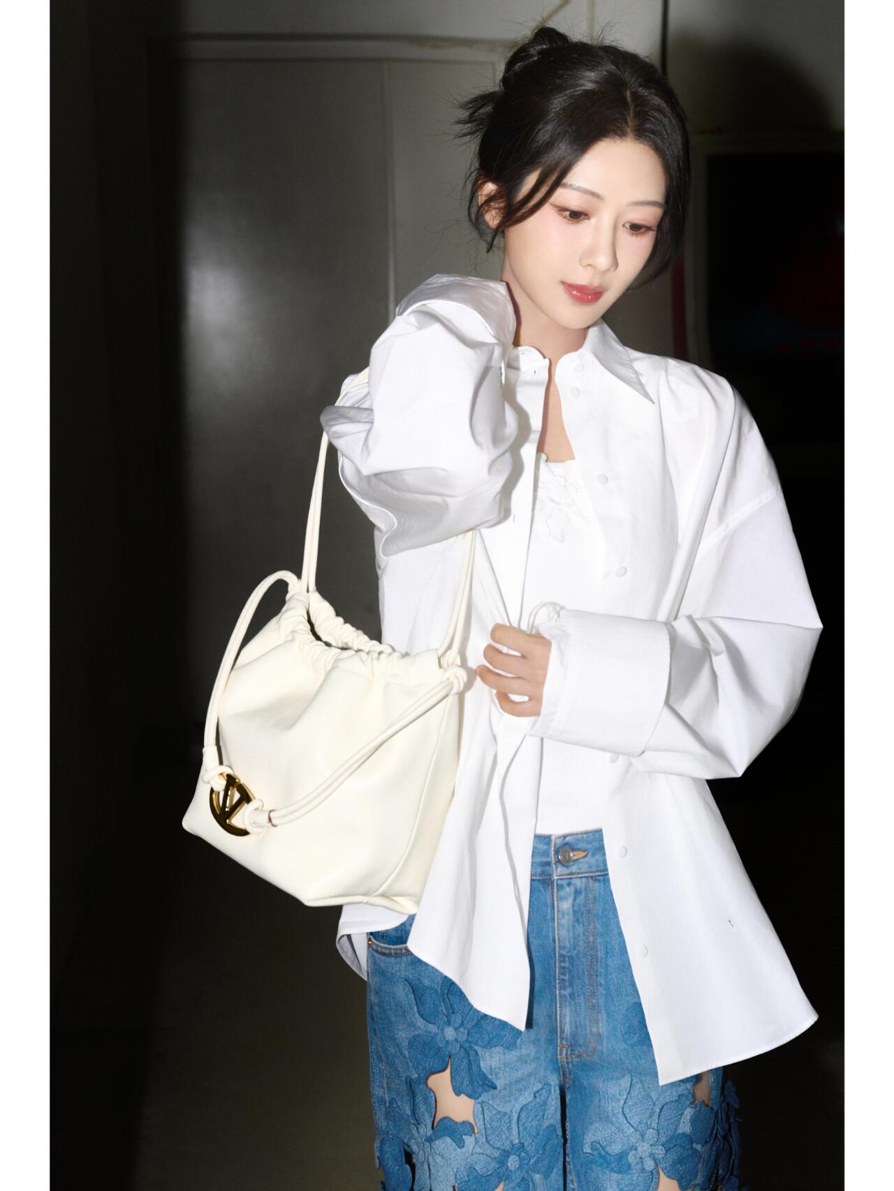 她穿了一件白色的衬衫,内搭白色小背心,搭配一条蓝色渐变花瓣图案镂空的牛仔阔腿裤,背白色的包包,清爽时髦有个性.
