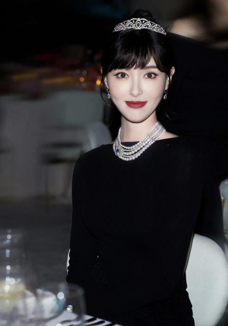 这赫本风造型太养眼了。齐刘海高丸子头,利落甜美。戴银色闪钻王冠,贵气复古。