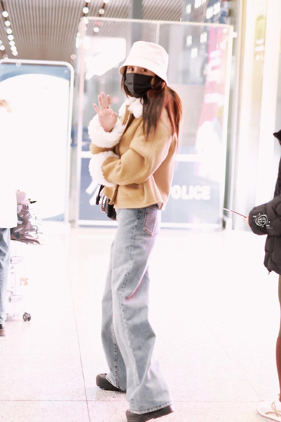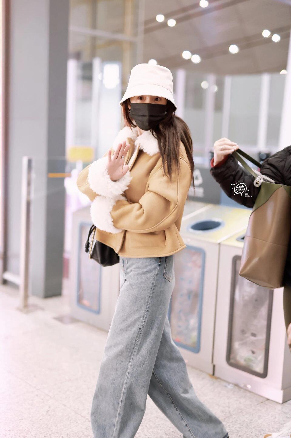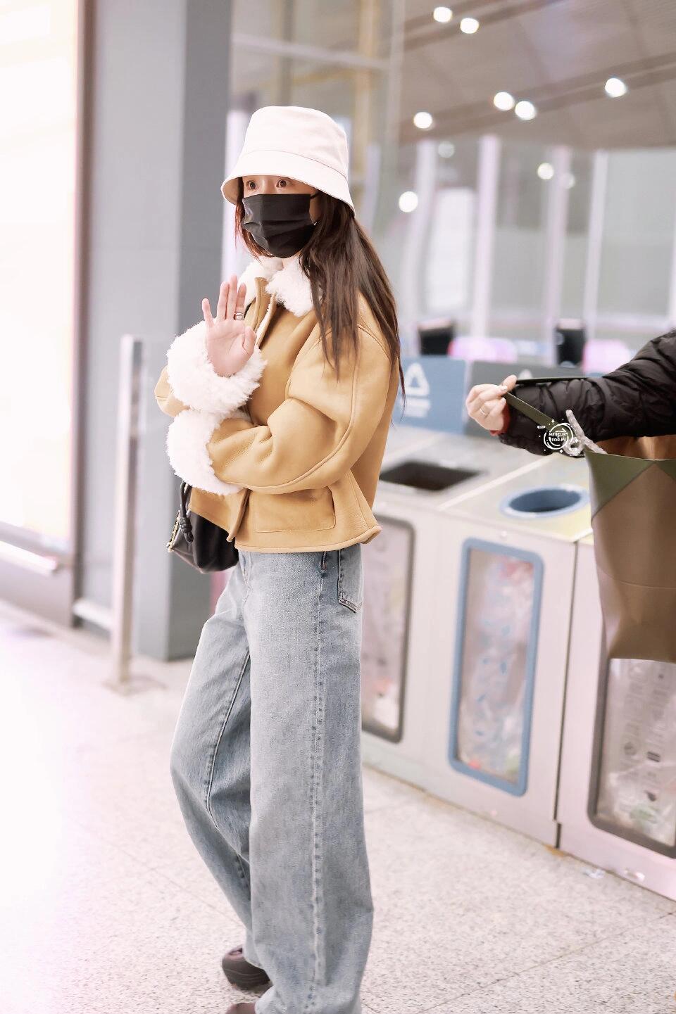 戴一顶米白色渔夫帽,穿驼色毛边短外套,搭配蓝色直筒长裤,配黑色厚底短靴。显高大气又利落。保暖效果也不错。