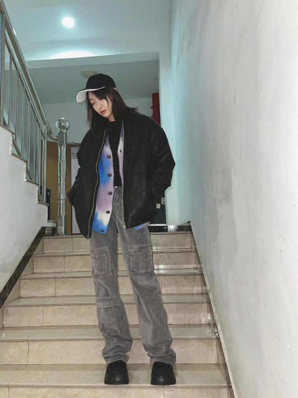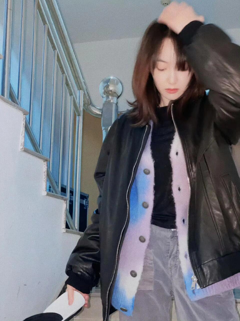 宋茜皮衣配针织开衫配工装裤