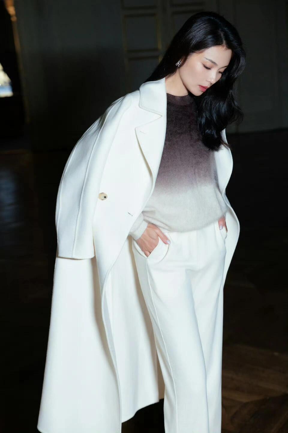 穿一件白色大衣,内搭灰紫色渐变色毛衣,搭配白色直筒裤,脚上穿白色高跟鞋。简洁优雅很有气质。
