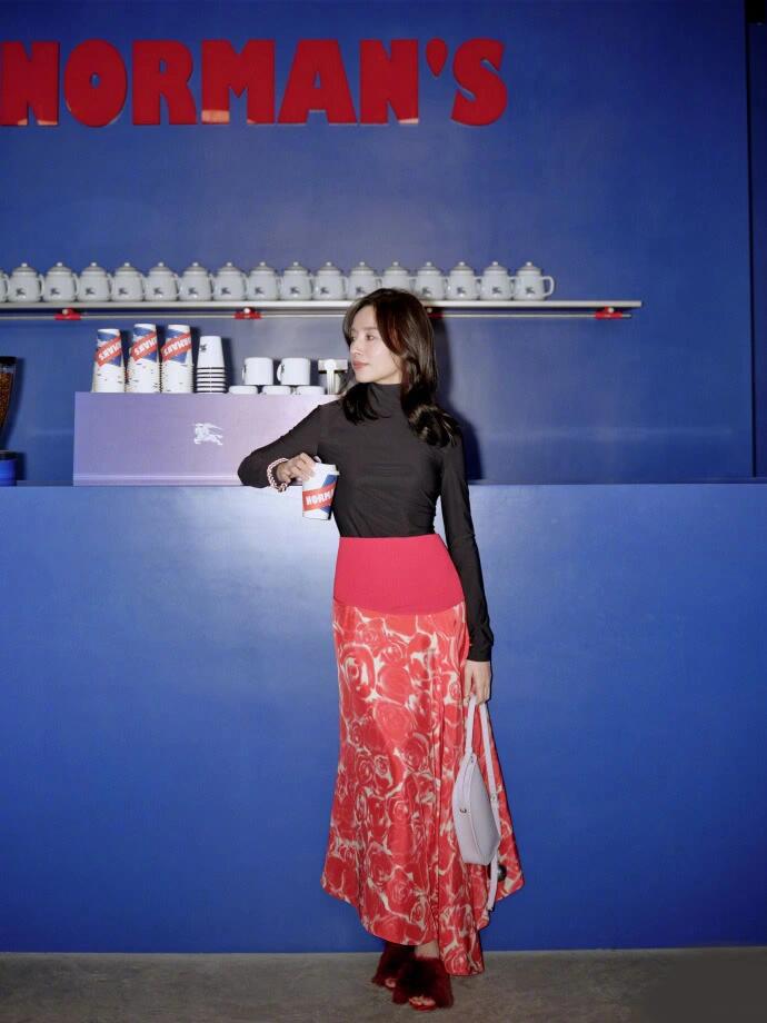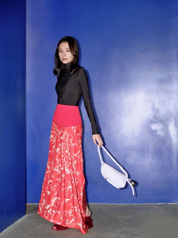 她穿了一件黑色的高领毛衣,搭配一条红色的高腰半身长裙,脚上穿双深红色的毛绒高跟拖鞋。优雅明媚又大气,还蛮有女人味的。